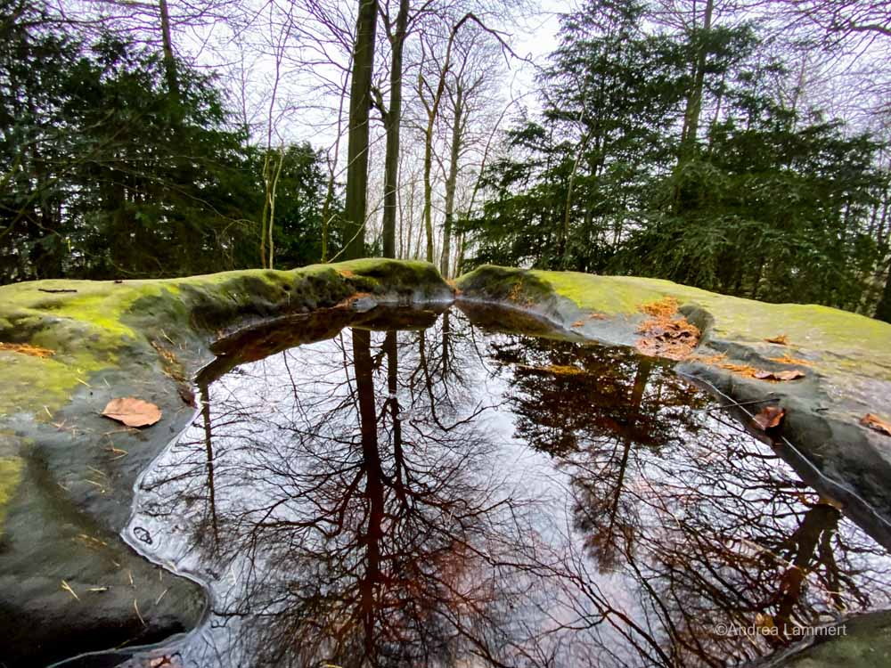 Doch erstmal zur Alten Taufe, die auch Wolfstaufe genannt wird. Es ist ein ziemlich großer Findling in Form eines Quaders, dessen Oberseite wie ein Taufbecken behauen wurde. So findet sich dort eine riesige Schüssel, die an dem Tag, als wir erreichten, wie ein großer Spiegel wirkte. Blank und die Bilder der Baumkronen wiedergebend. Um die Alte Taufe im Deister ranken sich verschiedene Sagen. Fest steht: Es ist ein kraftvoller Platz, aber nicht unbedingt einer, der einen gut und leicht fühlen lässt. Ich fühlte mich eher befangen und schwer, man könnte es auch positiv formulieren, dass ich mich dort erden konnte.