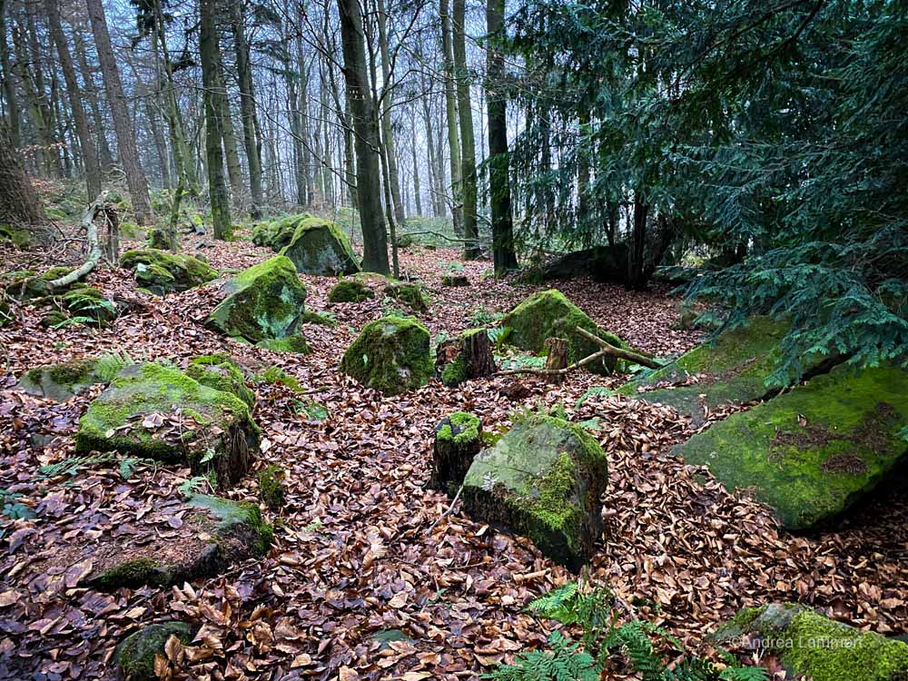 Nun geht es bergauf bis zu einer kleinen Hütte. Schon bald ändert sich der Wald, mein Gefühl beim Gehen wurde irgendwie anders. Erst später erfahre ich, dass dieses Stück Wald auch Teufelskammer genannt wird. Es ist der Wald rund um den Nordmannsturm, der so genannt wird und noch einen anderen Kraftplatz bereit hält. Tatsächlich stehen dort andere Bäume und die sehen auch gleich viel kraftvoller aus als die anderen. Zudem wimmelt es in diesem Gebiet von Gesteinsbrocken, die wie zufällig dort hingeworfen scheinen. Ich gehe automatisch ein wenig langsamer und spitze die Ohren und meine feinen Sinne für die Naturgeister.