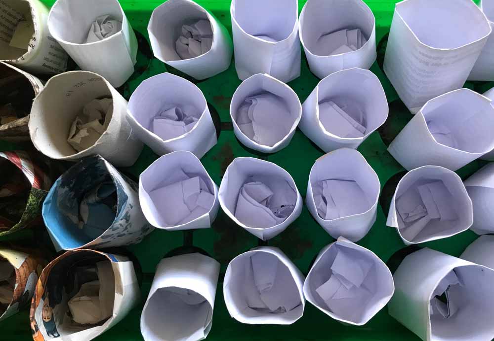- Din A5-Papier, am besten das, wo man eine Seite schon gebraucht hat, etwa alte Anschreiben, Mitteilungen etc, sehr gut gehen auch Klopapierrollen (Achtung aber: Auf die Tinte achten, die enthält möglicherweise Giftstoffe)