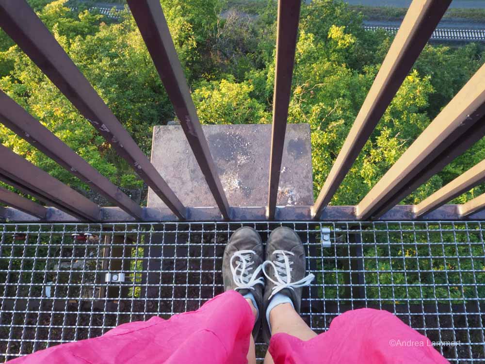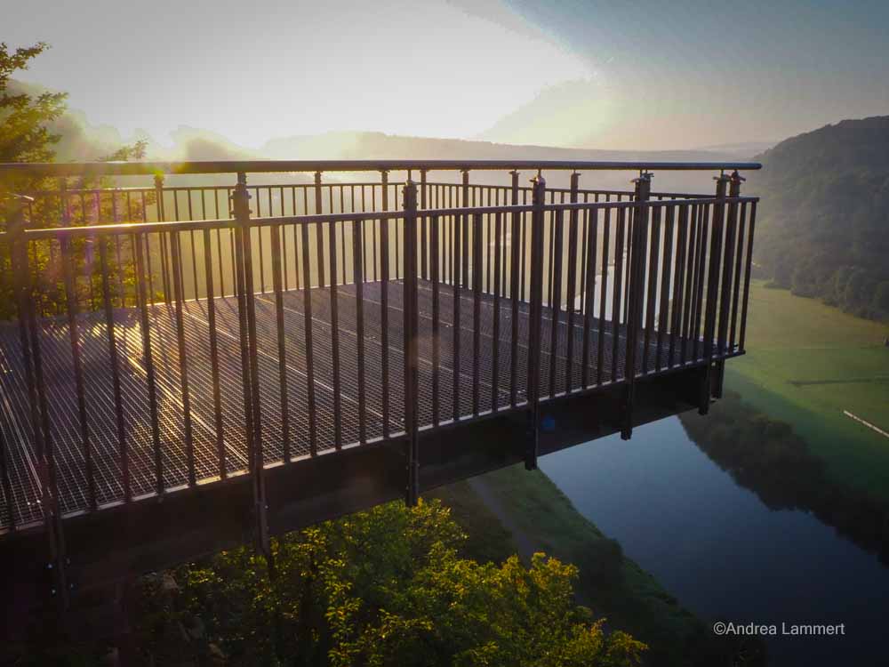 Entstanden ist eine Stahlkonstruktion, die wie ein großer Balkon aus den Felsen herausragt und dem Besucher das Gefühl gibt, über der Weser zu schweben. Durch die Metallgitter kann man auch durch den Boden nach unten schauen, was nicht ganz Schwindelfreien Angst einjagen könnte. Doch die Überwindung lohnt sich: Der Ausblick ist einzigartig, vor allem morgens.