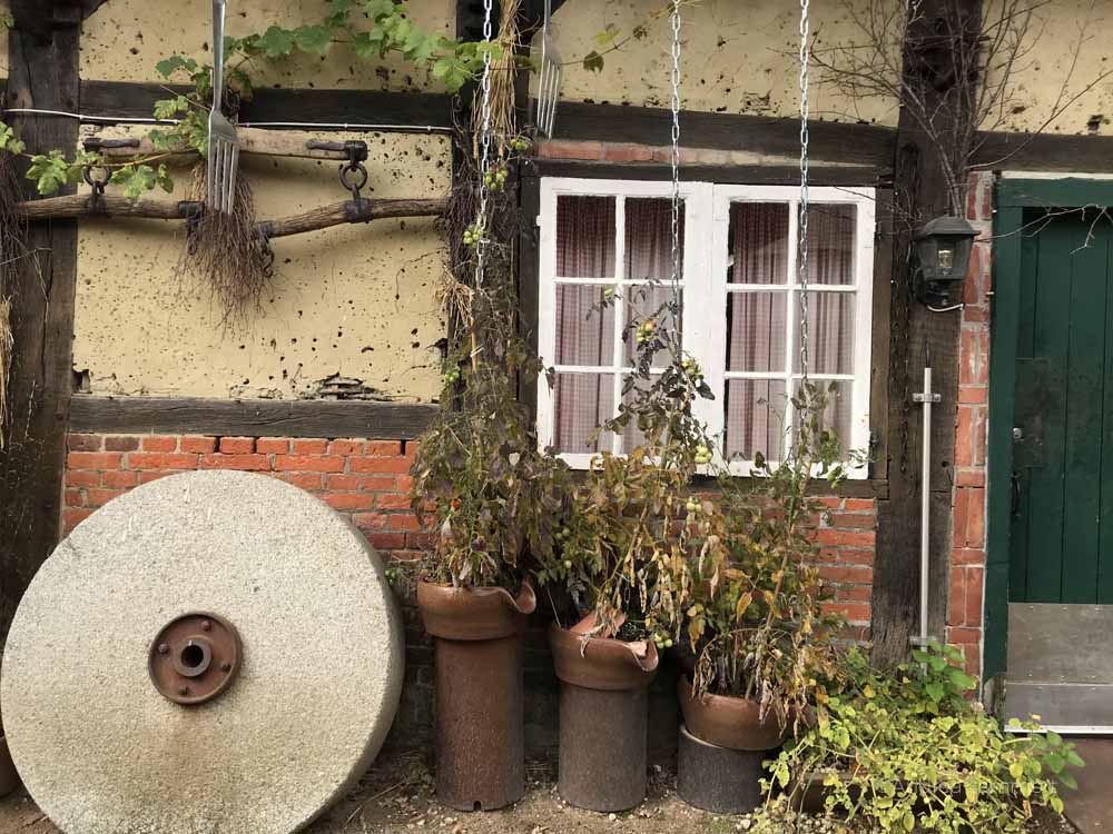Entlang an Kunst und schönen Rastplätzen mit Bänken geht es also in die Stadt. Nein, keine Fachwerkstadt, sondern ein typisches Kleinstädtchen mit Bäckereien und kleinen Fachgeschäften, etwa Aalräuchereien. Doch ich bin so früh, dass selbst die Bäckereien noch geschlossen sind. Also zurück ans Wasser. Da liegt auch das Freilichtmuseum mit seinen Mühlen und Fachwerkhäusern. Ein toller Platz, um in die alte Geschichte des Ammerlandes einzutauchen.