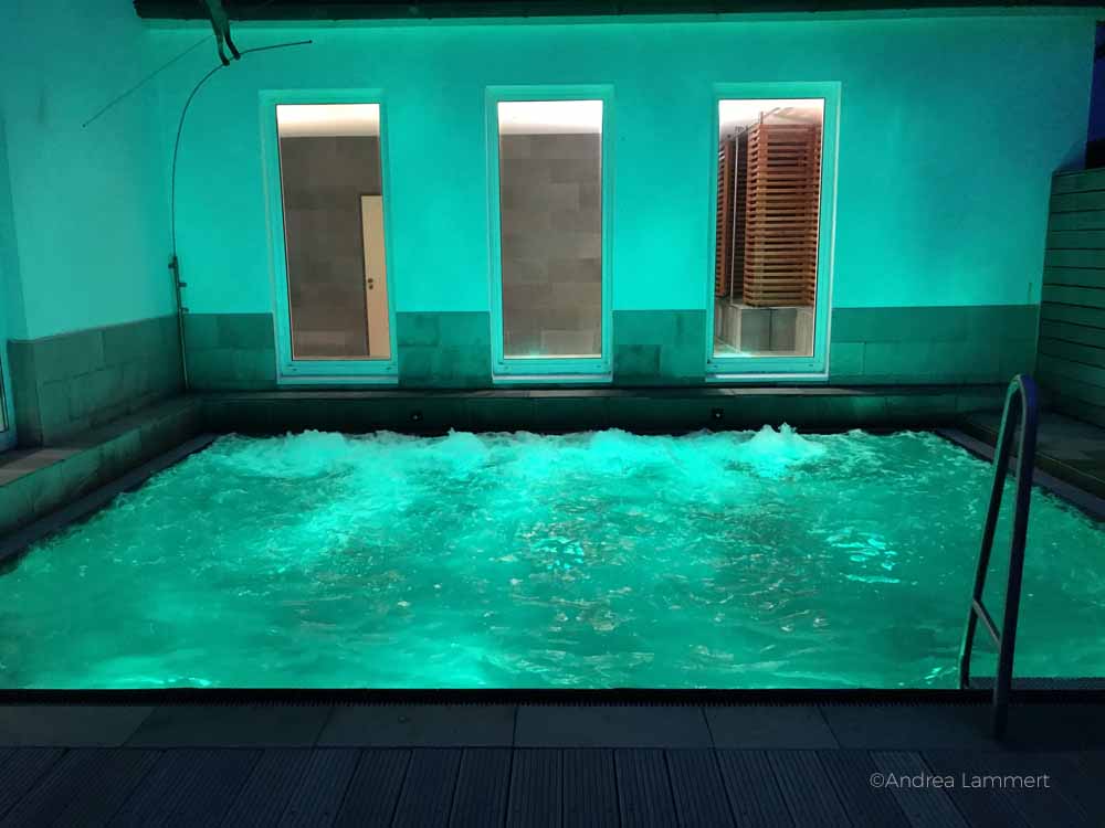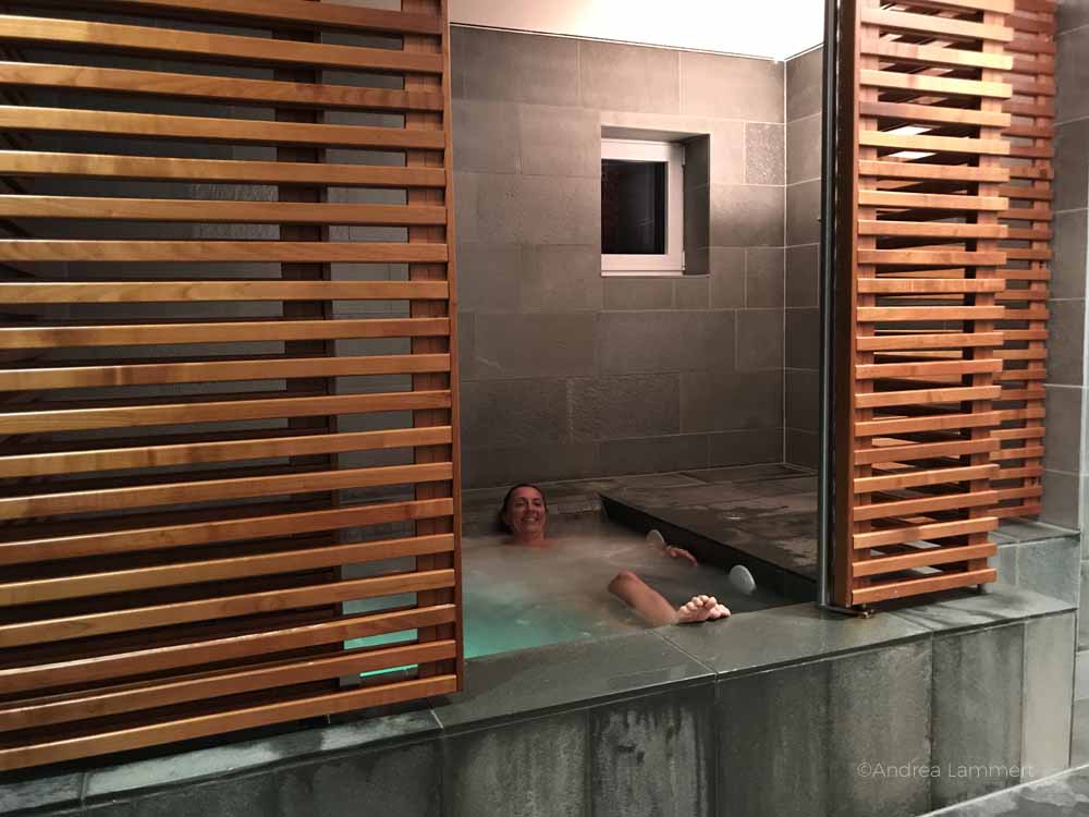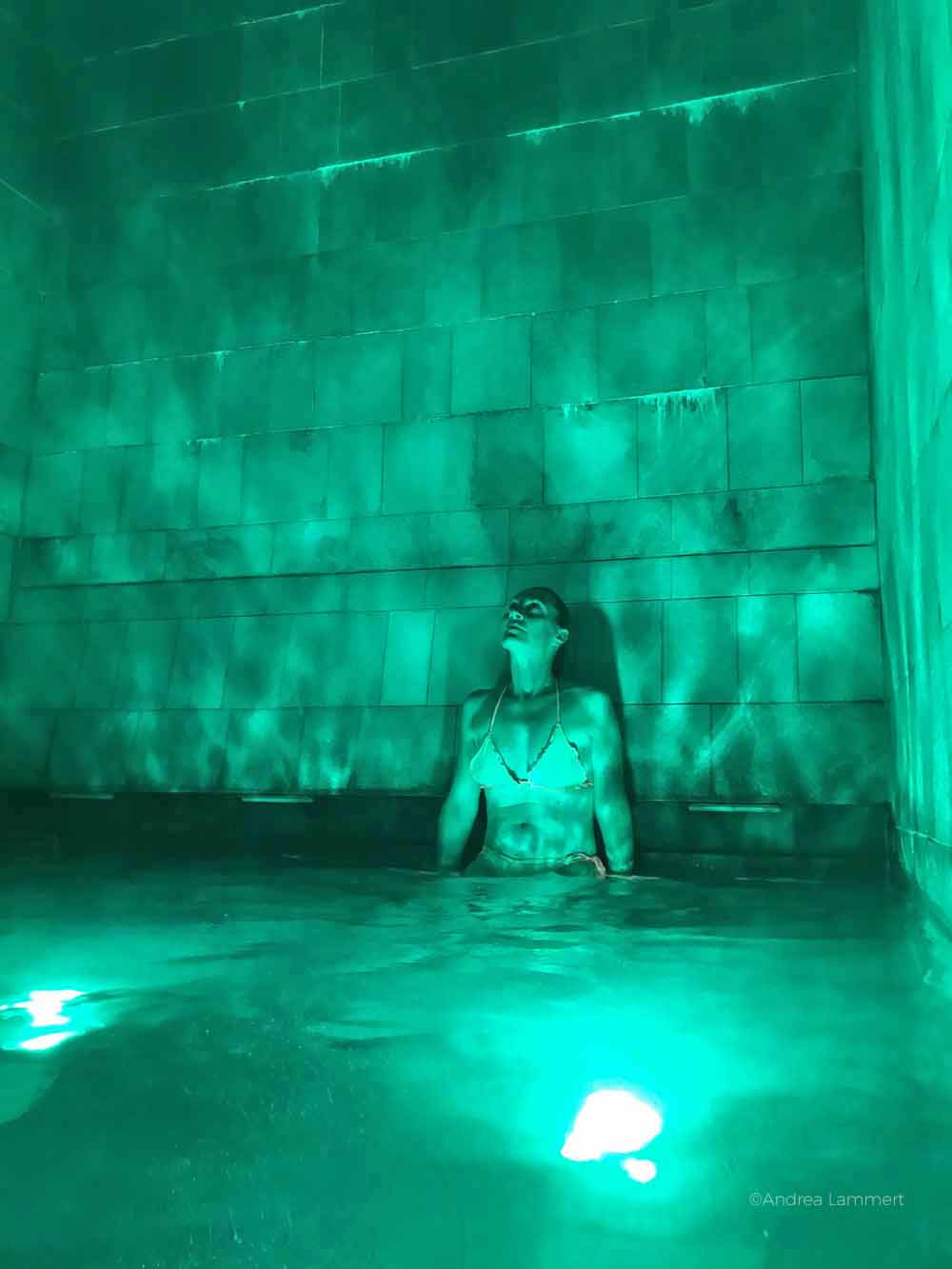 Doch das Badehaus kann noch mehr als das große Salzwasserbecken. Bislang habe ich noch keinen Ort gefunden, an dem ich so viele Möglichkeiten zur Wasserwellness hatte. Etwa im Feuerbad. Das Becken ist in grünes Licht getaucht, hoch über mir kann ich die Sterne sehen. Doch zunächst kostet es mich Überwindung, mich ins Wasser gleiten zu lassen. Denn das hat Fiebertemperatur – über 40 Grad.