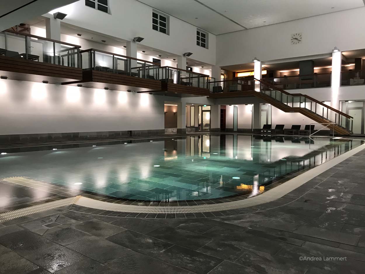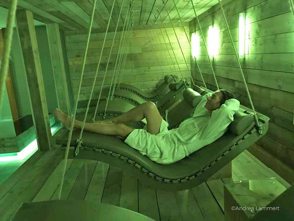 Es gibt noch so viel andere Wasserangebote zu entdecken, ein Draußenbecken, in grünes und blaues Licht getaucht, von dem aus man in den Himmel schauen kann oder kleine Separés, in denen sich Whirlpools befinden. Wer will, kann Kneippbecken ausprobieren, gigantisch hoch hängende Duschen oder einfach den Saunabereich genießen. Besonders schön ist die Außensauna auf dem Dach – und die Ruhezone mit den schaukelnden Stühlen.