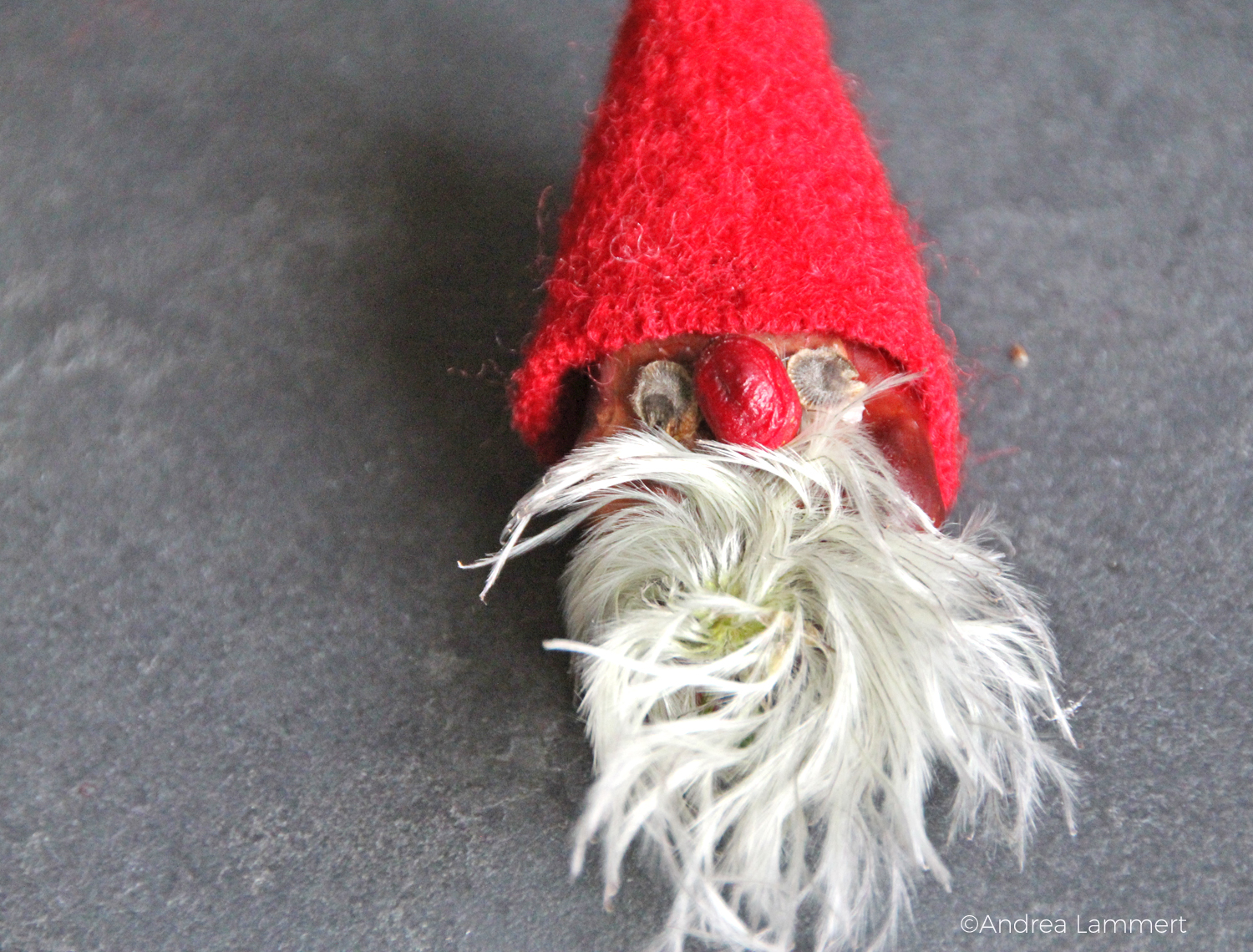 Mit dem Kleber die Clematissaat als Bart festkleben. Eine rote Frucht als Nase darüber festkleben und auf den Kopf entweder ein „Topet“ aus Clematis- oder Herbstanemonensaat basteln oder eine Mütze aus rotem Filz, jetzt noch Augen aus Stockrosensaat aufkleben und fertig ist der Wichtel. Ging bei mir in 5 Minuten und sieht doch echt süß aus, oder?