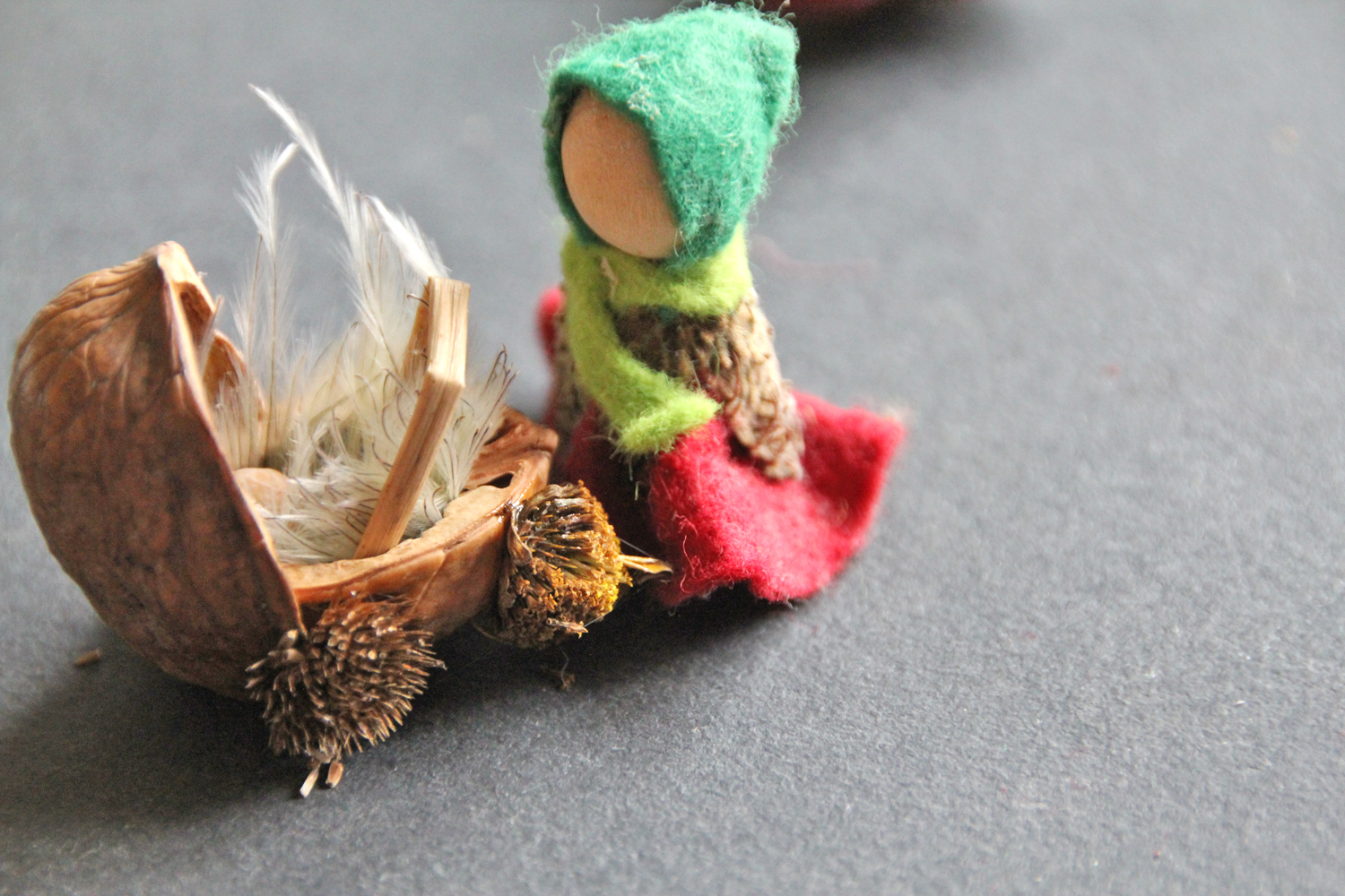 Eine Holzperle aus Kopf auf die umgedrehte Buchecker stecken. Darunter aus einem Streifen Filz einen Schal binden. Aus Filz (oder anderem Stoff) einen Kreis ausschneiden und als Kleid in die Buchecker kleben. Und oben aus dem Filz eine Mütze fertigen für den Perlenkopf. Fertig ist der Wichtel. Meine Kinder lieben sie.