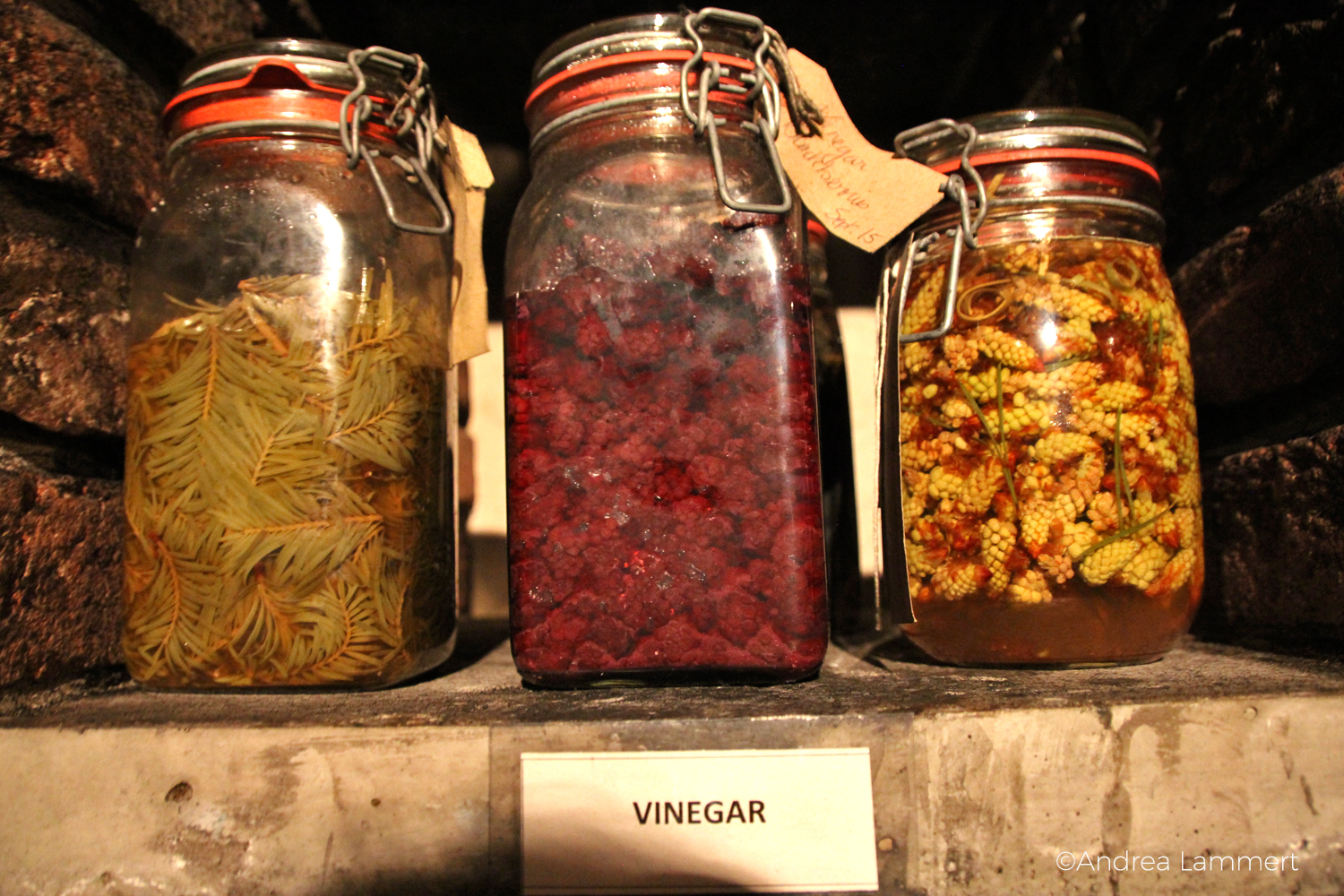 Hinterher gibt es für alle Gäste ein Käsebuffett – im allerheiligsten des Restaurants, der Speisekammer. Sie sieht aus, wie man sich eine Speisekammer der Großmütter vorstellt: Große Weckgläser mit Pickles, eingelegten Blättern oder Essigsorten. Von der Decke baumeln selbstgemachte Würste, in den Regalen liegen selbstgefertigte Käse. Jetzt verstehe ich besser, wie das Restaurant nur auf Regionales setzen kann und das, was gerade wächst. Es wird viel eingemacht, Pilze getrocknet ebenso wie Gemüse fermentiert – ganz wie früher und sehr nachhaltig eben. Ohne dabei den Geschmack zu verlieren. Tolles Konzept.
