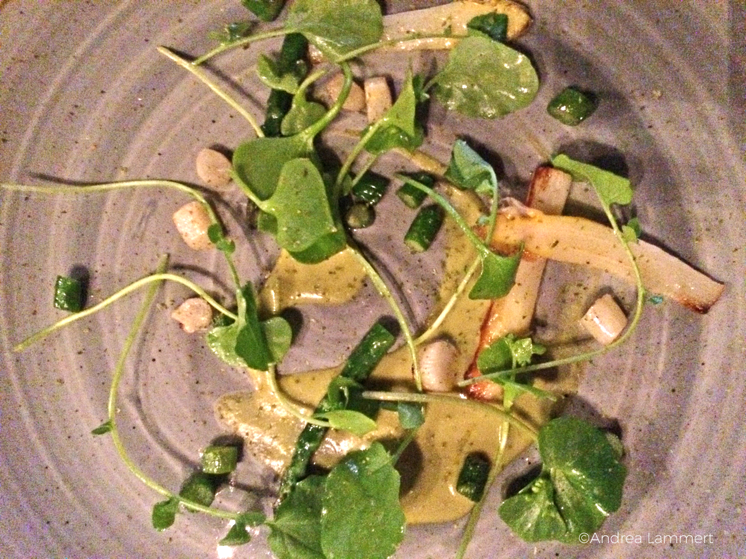 Der nächste Gang zaubert ein Lächeln auf mein Gesicht, denn es gibt Portulak, meinen Lieblingssalat. Dazu gebratenen Spargel – grün und weiß – sowie Kresse. Das ist der wunderbarste Gang bislang, so fein und gut abgestimmt habe ich Spargel noch nicht häufig gegessen. Wenig Fett dazu, denn die Soße bestand aus Kopfsalatschaum und dazu der fein nussige Geschmack des Portulaks – herrlich. Es folgen noch viele weitere Gänge, meine Highlights waren dabei frittierte Brennnesselblätter auf dem Gurkencarpaccio, die hätte ich auch anstatt Chips essen können. Dass man auch die Blüten des Bärlauch als Dekoration benutzen kann, merke ich mir ebenso wie die Sachen mit den Erbsensprossen. Und als Verdauungstrunk gibt es einen Schnaps aus Buchenblättern – erstaunlich und sehr schmackhaft.