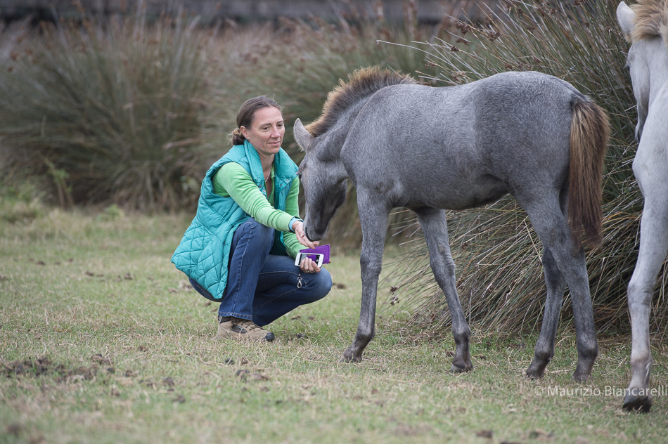 Die Tiere sind wild und scheu und stehen in einer Gruppe etwas abseits. Maurizio packt seine Kamera aus, sein Stativ und beginnt zu arbeiten. Klacklackklackklack geht sein Auslöser. Still wie ein Baum steht er in der Landschaft, total mit der Natur verwachsen. Die Pferde stört er nicht. Ich habe eher das Gefühl, sie möchten sich fotografieren lassen. Ich verstecke mich mal vorsichtshalber hinter einem Busch. Zwei Stuten brechen aus der Herde aus und huschen in meine Richtung, ganz ruhig, gar nicht verschreckt. Die Fohlen folgen ihnen.