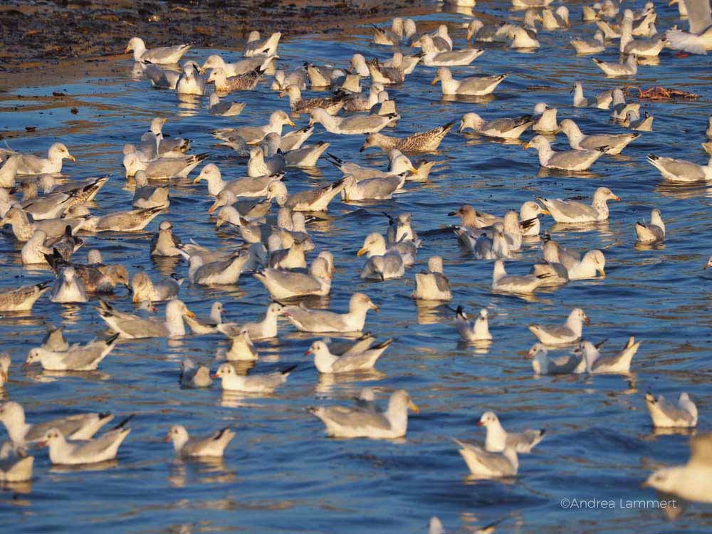 So viele Möwen. Der Strand flimmert von ihrem Geflatter. Weißes Gewusel. So ein Geflimmer habe ich noch nie gesehen, schon gar nicht auf dem Wasser. Und die Möwen haben Spaß. Es scheint, als spielten sie Wellenreiten mit dem Meer. Die Flut kommt und bringt die Vögel zum Tanzen.