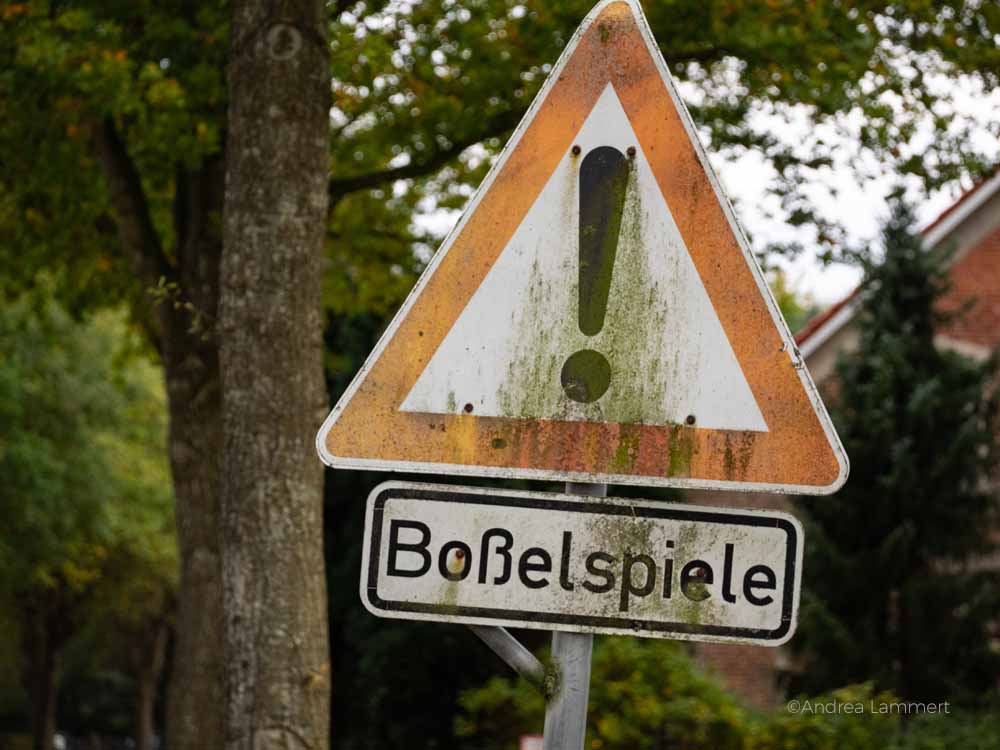 Also dachte ich, ich fahre besser rechts ran, als dass mich die Kugel trifft. Doch das war eben falsch. Mein Auto stand genau in Wurfrichtung. Ich konnte gleich wieder einsteigen und umparken. Der Mann, der mich angesprochen hatte, war nur die Vorhut einer ganzen Mannschaft, die hinter ihm um die Kurve bog. Kaum hatte ich mein Auto weggefahren, nahmen sie auch schon Anlauf und warfen die Kugel. Ich wartete, bis sie vorbei waren, wollte grade wieder einsteigen, da sah ich die nächste Mannschaft um die Ecke biegen. Und nach ihnen wieder die nächste. Man braucht also viel Zeit, wenn man sonntags die Nebenstrecken im Landesinneren von Ostfriesland benutzt. Tatsächlich warnen dort viele Schilder vorm Boßeln im Straßenverkehr.