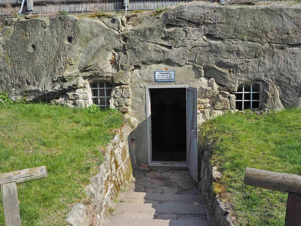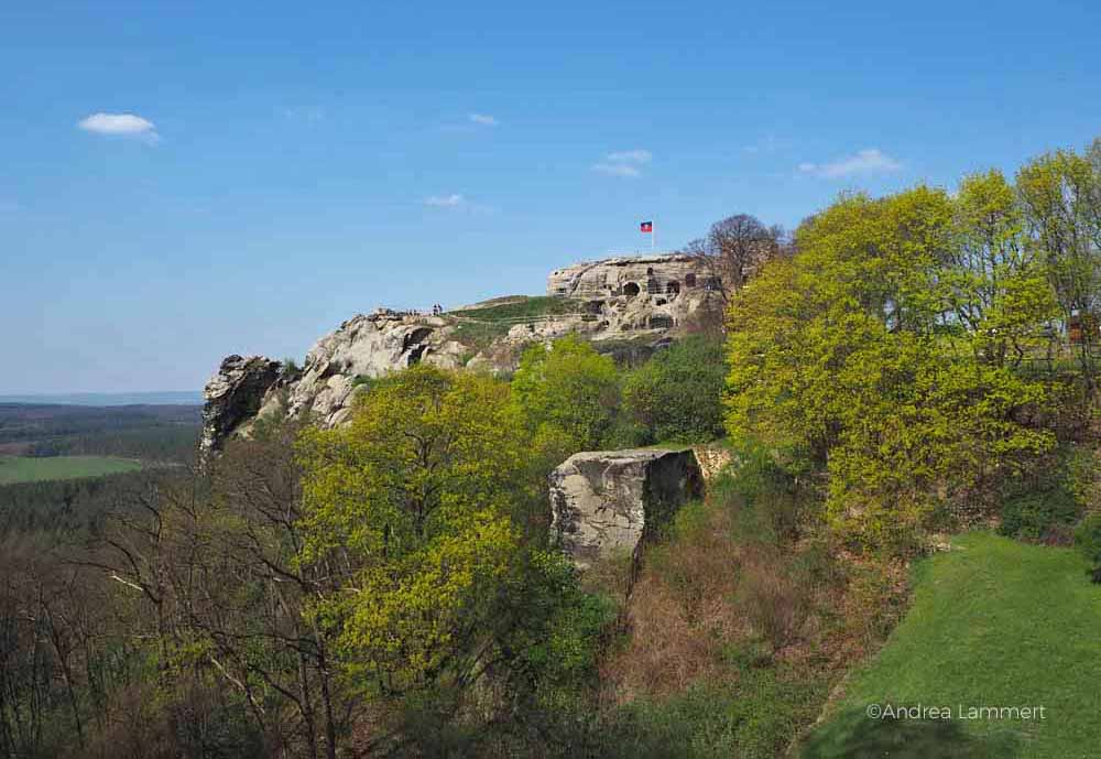 Es gibt eine echte Kanone, ein Verließ, abgerundete Felsen, Gräben, in Stein gehauene Treppen und immer wieder diese Höhlen. Diese in Fels gehauenen Räume mit Blick über das Harzvorland bringen die Kinder zum Staunen: Statt Zimmern war auf Regenstein einfach alles in den Fels gehauen: Pferdestelle, Kasematten oder auch einfache Wohnräume. Heute sind nur die Höhlen geblieben. Sie sind ein perfekter Platz, für die Kinder um zu spielen und zu entdecken.