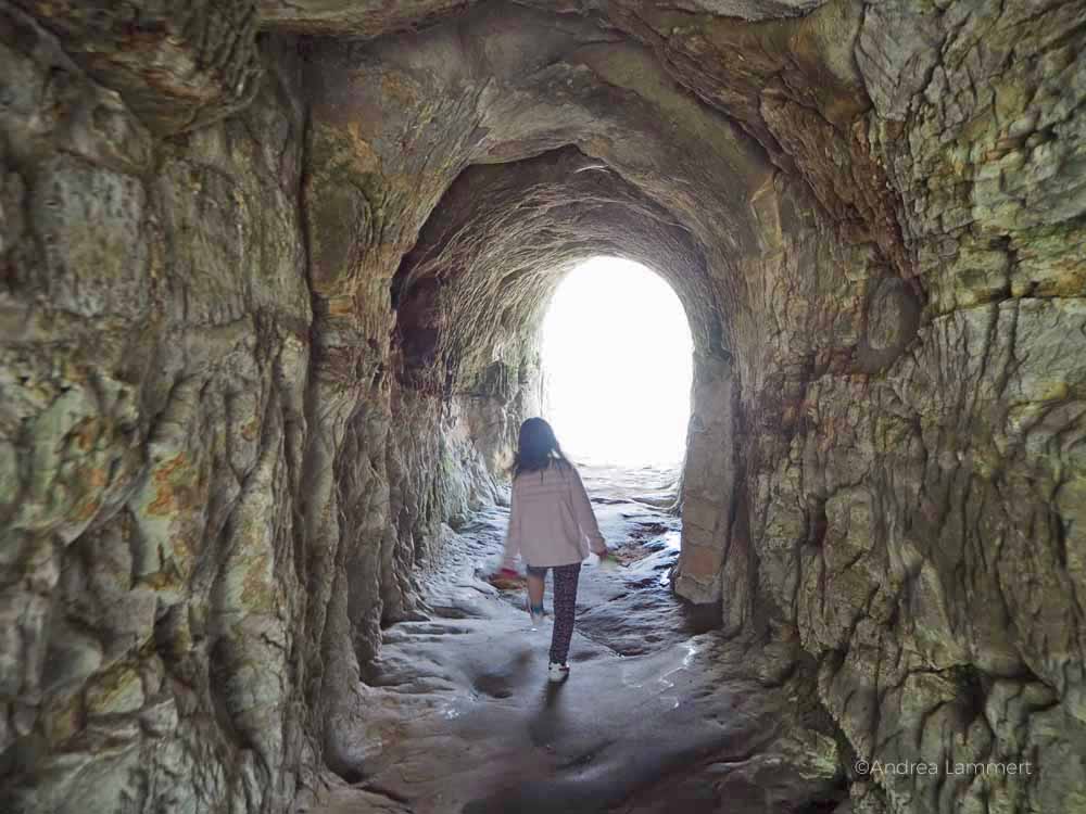 Meine Tochter turnt schon oben auf dem Felsen herum, während die Jungs in den Höhlen verschwinden. Die Kleinste kann von dem langen, dunklen Gang nicht genug bekommen, durch den sie rennt. Diese Höhlen sind wirklich aufregend und der Tag ist perfekt, denn die sonst so computerfixierten Teenager blühen plötzlich auf und spielen Rollenspiele.