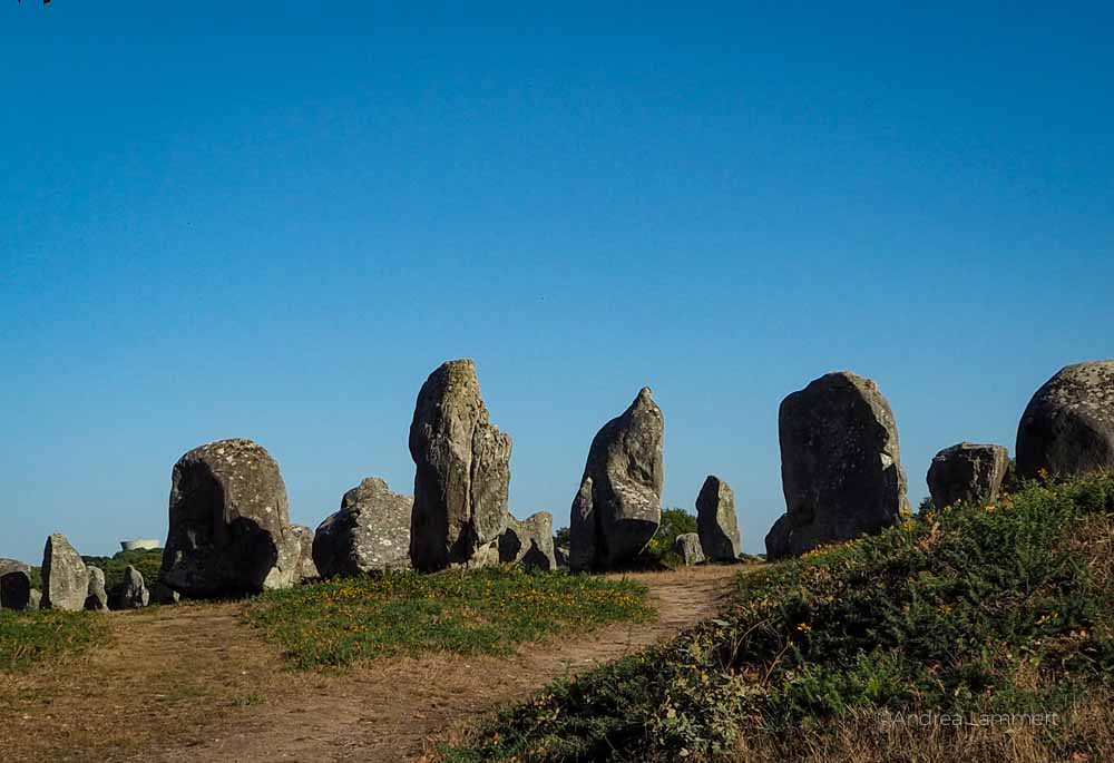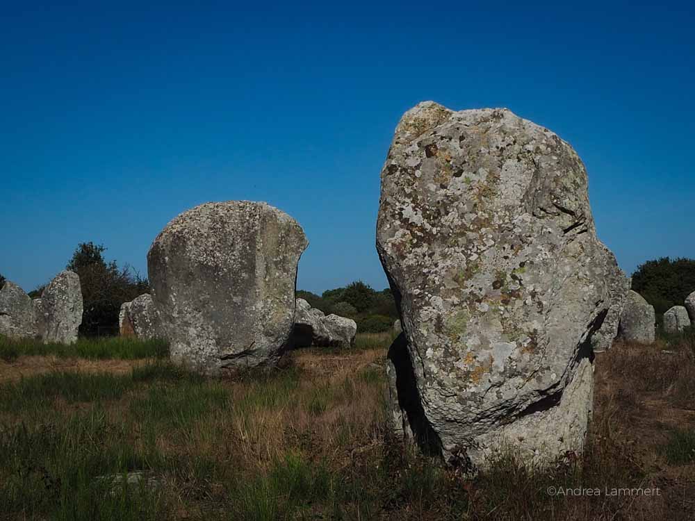 Wie sie dorthin gekommen sind, ist mir grade egal. Ich muss nicht alle Fragen beantwortet haben, ich staune einfach nur. Über diese einzigartige Stimmung, die in diesem Ort ein ganz eigenes Feld erschaffen hat, einen Raum, der sich wohl auch für Menschen erspüren lässt, die nicht so hellsichtig oder hellfühlig sind. Wie sonst lässt es sich erklären, dass sie, eben noch gehetzt aus dem Auto steigend und eigentlich nur schnell auf der Suche nach einem Platz für das Selfie plötzlich ruhig werden und sich treiben lassen. Staunend durch die Steinreihen streifen und sich Zeit nehmen, um diesen Platz zu erforschen anstatt einfach nur von der Reisezielliste abzuhaken, wie ich es bei den Leuchttürmen der Bretagne gesehen habe?