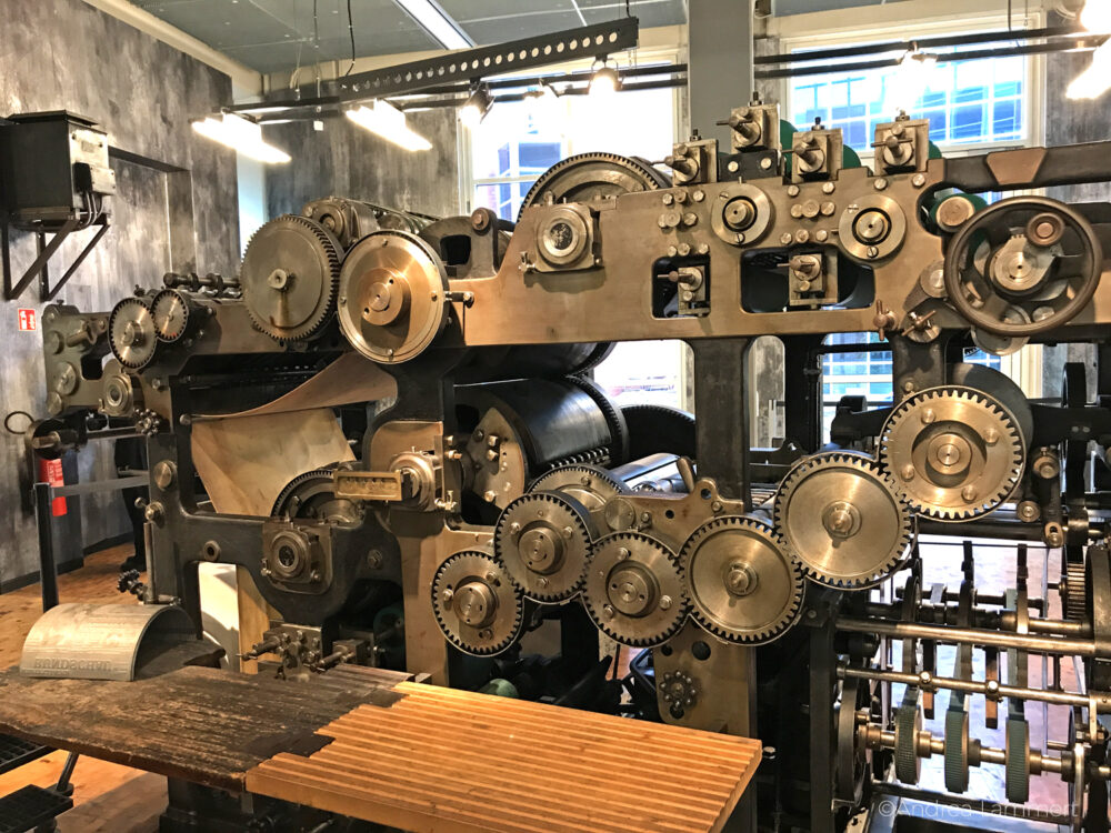 Am Space-Curl, einem Gerät, das wie ineinanderverdrehte Hula-Hopp-Reifen aussieht, drängen sich die Schulklassen, zu spanend ist es zu schauen, was passiert, wenn man sich um die eigene Achse in alle Himmelsrichtungen drehen kann. Ich schaue mir stattdessen die Ausstellung über den Wettlauf der Nachrichten an, bin fasziniert von der Schönheit der alten Druckermaschinen. Überhaupt hatten Maschinen damals viel mehr Stil und Ausstrahlung als die Kästen heute. Spannend finde ich an fast jeder Stelle, zu sehen, wie sich die Arbeitsplätze verändert haben. Alte Telefone auf aufgeräumten Schreibtischen statt Computer und Handy. Wenige Räume weiter donnern die riesigen Wegstühle ihre Schiffchen durch das Fadengewirr und im Bereich Medizin kann man sogar einen Anzug anziehen, der einen erfühlen lässt, wie es ist in einem alten Körper zu stecken.