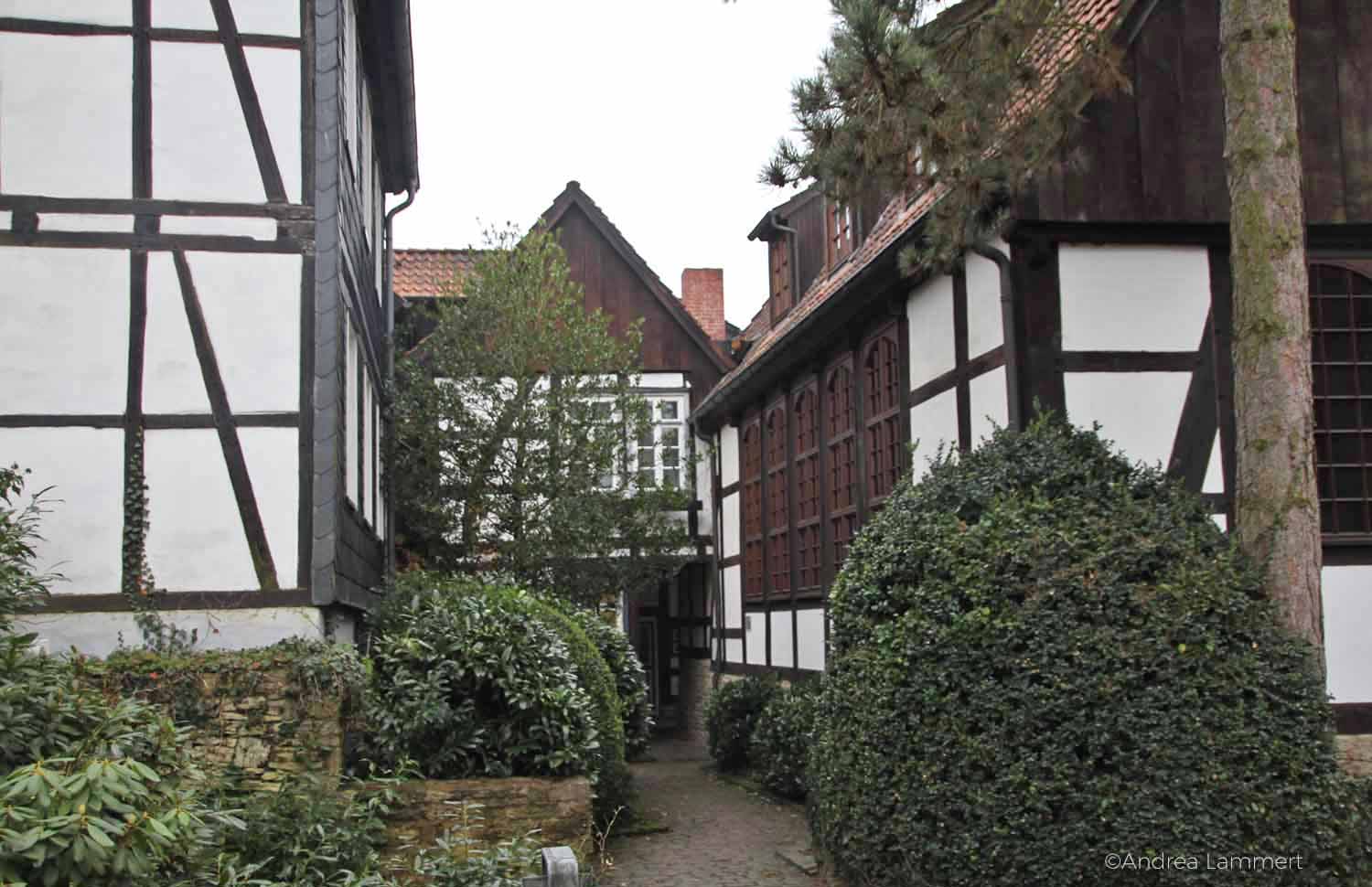 Wenn Häuser einen Bauch haben oder sich schief über Kopfsteinpflaster biegen, dann strahlen sie immer eine ganz besondere Atmosphäre aus. Das Pflaster unter meinen Füßen klappert und ich fühle mich irgendwie, als würde ich entlang der Stadtmauer laufen. Später lese ich, dass ich es tatsächlich tat, denn die Häuser der Adolfstraße sind im Mittelalter teilweise auf der Stadtmauer errichtet worden. Die Adolfstraße gehört auf jeden Fall zu den Top 10 der Sehenswürdigkeiten in Detmold. Den Namen hat die Straße von einem Buchbinder namens Adolf Schumacher.