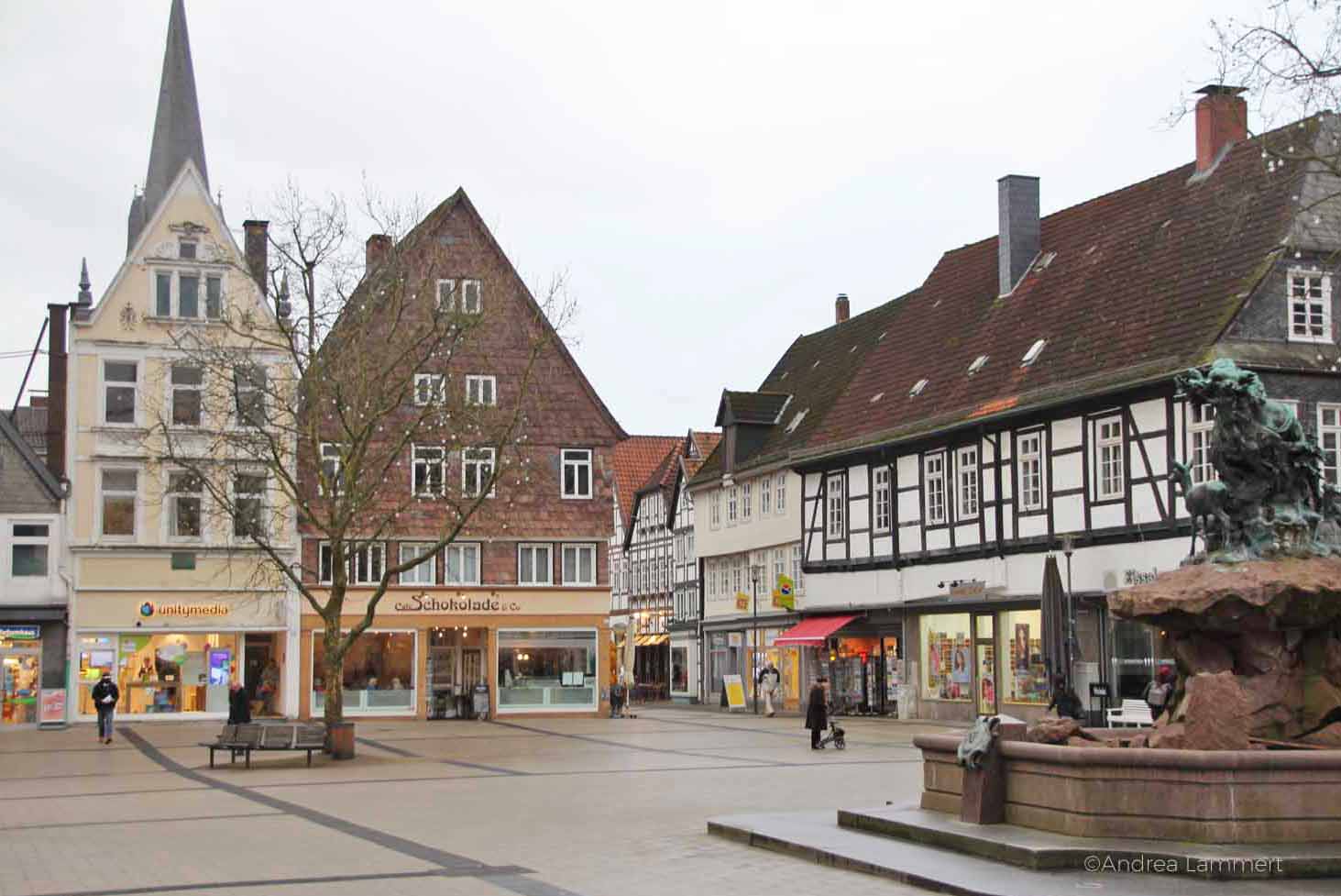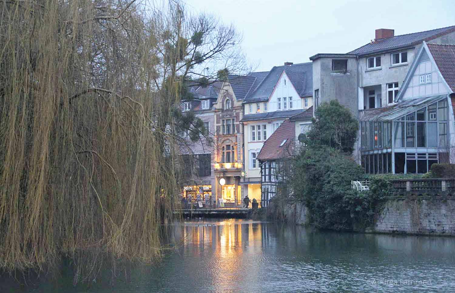 Zentrum der Stadt bildet das Schloss, das im Stil der Weserrenaissance erbaut wurde. Ein wunderschöner, kleiner Park mit alten, knorrigen Bäumen liegt vor dem Schloss, dahinter befindet sich ein Schlossteich mit schwarzen Schwänen. Im Sommer muss es traumhaft sein, hier am Wasser zu sitzen und einfach zu verweilen. Mir ist es doch ein wenig kalt jetzt und ich ziehe weiter und schaue mir noch die schönen, kleinen Läden in Detmold an.