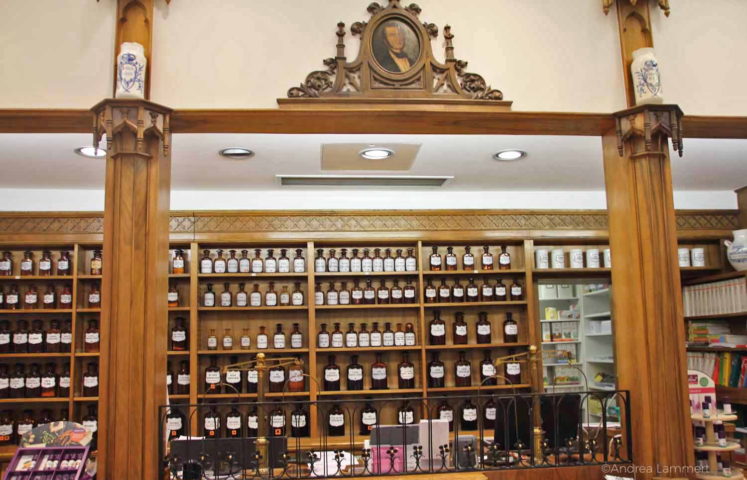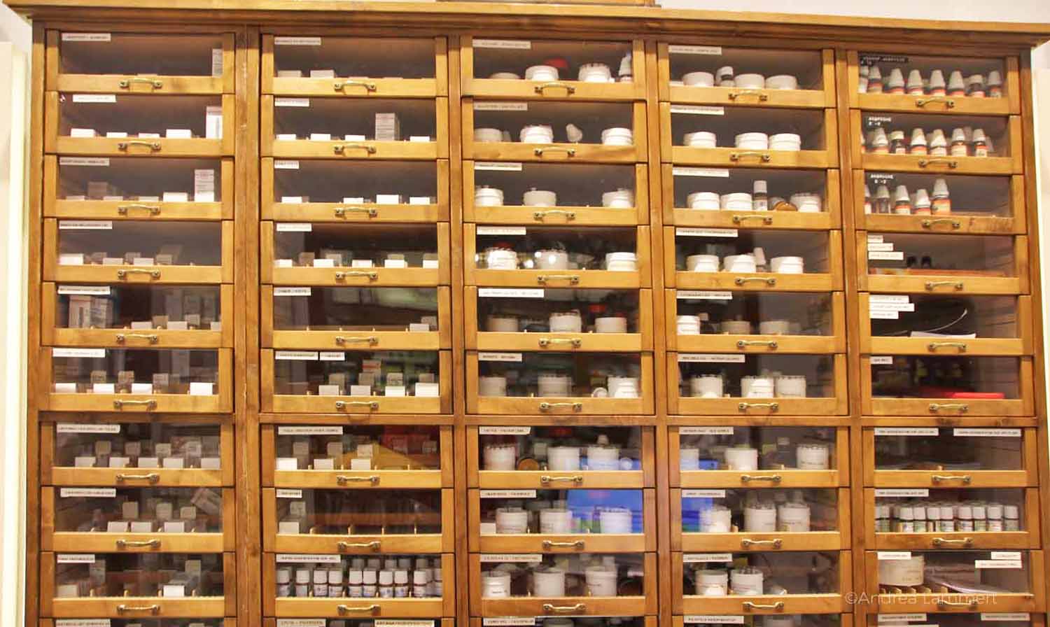 Schon beim Blick durch die Fenster sehe ich, dass es eine besondere Apotheke sein muss. Ich gehe hinein und frage, ob ich ein Foto machen dürfe und bin nicht nur fasziniert von den vielen Schubladen und Regeln, sondern auch, dass es eine der wenigen Apotheken ist, die Homöopathie noch selbst fertigt. „Wir hatten in der Stadt einst ein homöopathisches Institut, das Ärzte ausgebildet hat. Homöopathie hat in Detmold bis heute einen hohen Stellenwert“, erfahre ich von der Apothekerin und sie zeigt mir einen Schrank, in dem sich die Homöopathie befindet.