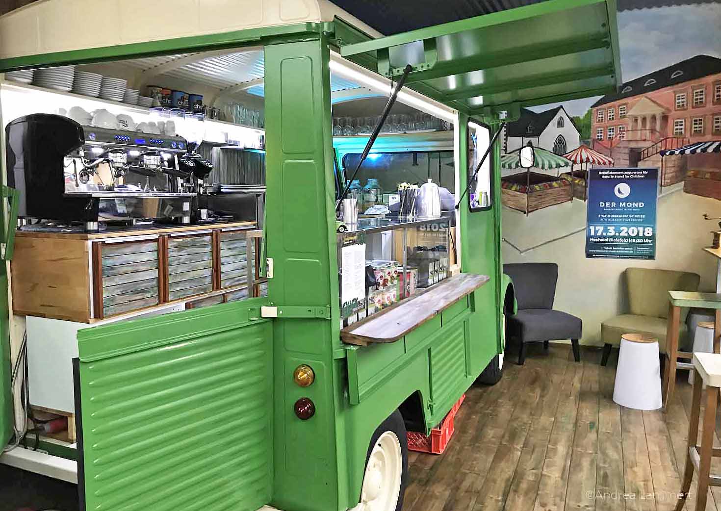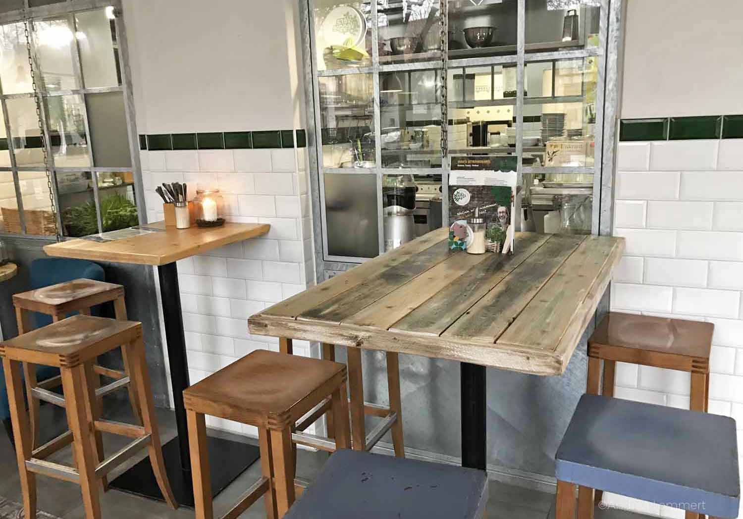 Das gefällt mir, ebenso wie der große, helle Raum, in dem sich schon ein junges Pärchen hingesetzt hat, um an einem Laptop zu arbeiten. Weiter weg sitzen zwei junge Mädchen mit Möhrenkuchen auf dem Tisch. Doch das schönste am Laden ist der kleine Food-Truck, ein Oldtimer LKW, der wie ein fahrender Kiosk zurechtgemacht wurde und lindgrün angestrichen im Laden steht. Die Inhaberin erzählt mir aber auch vom Bratwurststreit im letzten Jahr mit dem sie auch einen Nerv getroffen hat, weil sich eine Wurstbude direkt vor dem Laden niedergelassen und damit die Bürger der Stadt in Fleischesser und Vegetarier polarisiert hat.