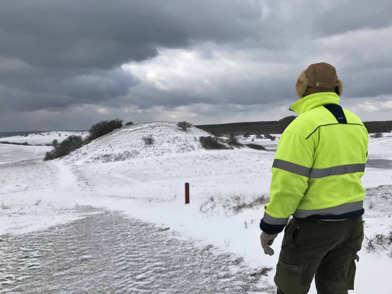 Der Ranger, der neben mir durch den knirschenden Schnee geht, sieht aus wie ein Marsmensch: Dicke Leuchtjacke, Pelzmütze auf dem Kopf und schweres Schuhwerk an den Füßen stapft er über den verschneiten Süden von Langeland. Einer Landschaft, in die Eiszeit Hügel wie Erdmützen geformt hat, wie Kegel ragen sie nun aus der flachen Landschaft. Ihnen zu Füßen liegen runde Spiegel, eingefrorene Teiche, denn die Ponys leben im Moor. „Wo sind die Pferde“, brummt Jan und steigt auf einen Hügel. Kein Pferd zu sehen. Wenn das Neugeborene krank ist, wird es sich selbst überlassen, die Herde von Langeland soll leben wie Wildpferde eben auch – ganz ohne Tierarzt. Jan ist die Furcht anzusehen, das kleine Fohlen vielleicht irgendwo liegen zu sehen. „Da, ein Hufabdruck“, sagt er und zeigt auf den Schnee. Schon bald sehen wir auch Pferdeäpfel, die in Dänemark übrigens Pferdebirnen heißen.