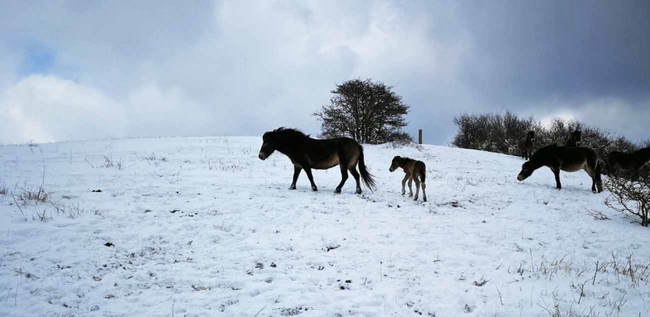Und als wir um den nächsten Hügel gegangen sind, sind sie auf einmal da. Wie eine Fata Morgana mitten in der Schneewüste. Unwirklich und doch so echt. Sie stehen dort im Schnee, dicht an dicht, haben an der windabgewandten Seite Schutz gesucht vor der beißenden Kälte. Viele braune Ponys mit zotteligem, dichten Fell und Eiskristallen um die Nüstern. Ich hatte eine Handvoll Tiere erwartet, aber nicht 60. Es ist einer dieser Momente, die man kaum in Worte fassen kann. Wildpferde, selbst wenn sie, wie diese, an Menschen gewöhnt sind, bleiben für mich etwas ganz Besonderes. Nie vergessen werde ich mein Erlebnis in der Emilia Romagna als ein wildes Fohlen zu mir kam und mich beschnupperte.