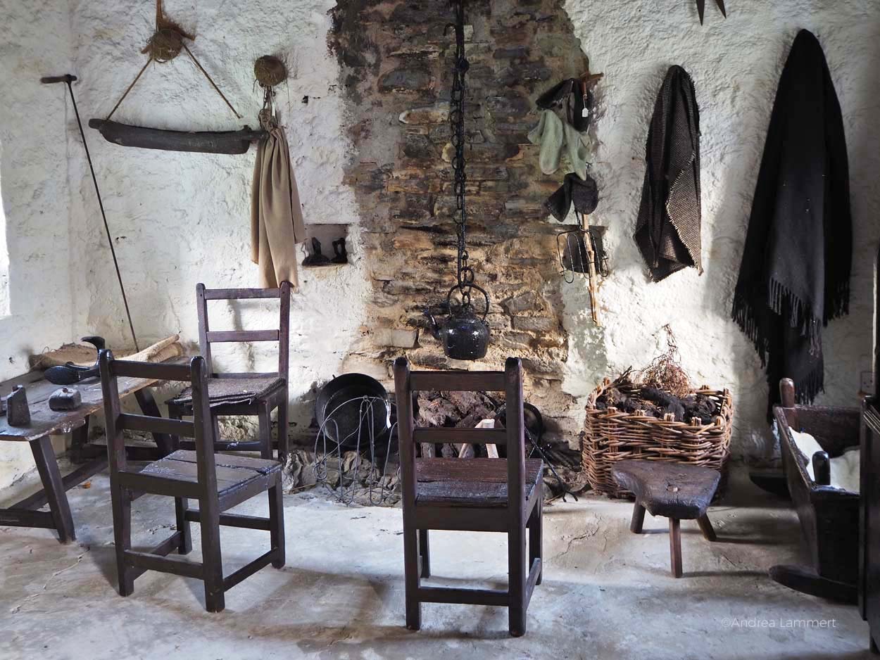 Also baute man die Betten als Alkoven (ein Bett, das mit Vorhängen oder einem schrankähnlichen Kasten geschützt ist), rückte als Familie mit 15 bis 20 Menschen in einem Haus eng zusammen. Dass das im 17. Jahrhundert so war, ist das eine, aber David erzählt uns, dass auch er in einem solchen Haus aufgewachsen sei und Wohlstand, Strom und fließend Wasser in einige Ecken Irlands erst in den letzten Jahrzehnten eingerichtet wurden.