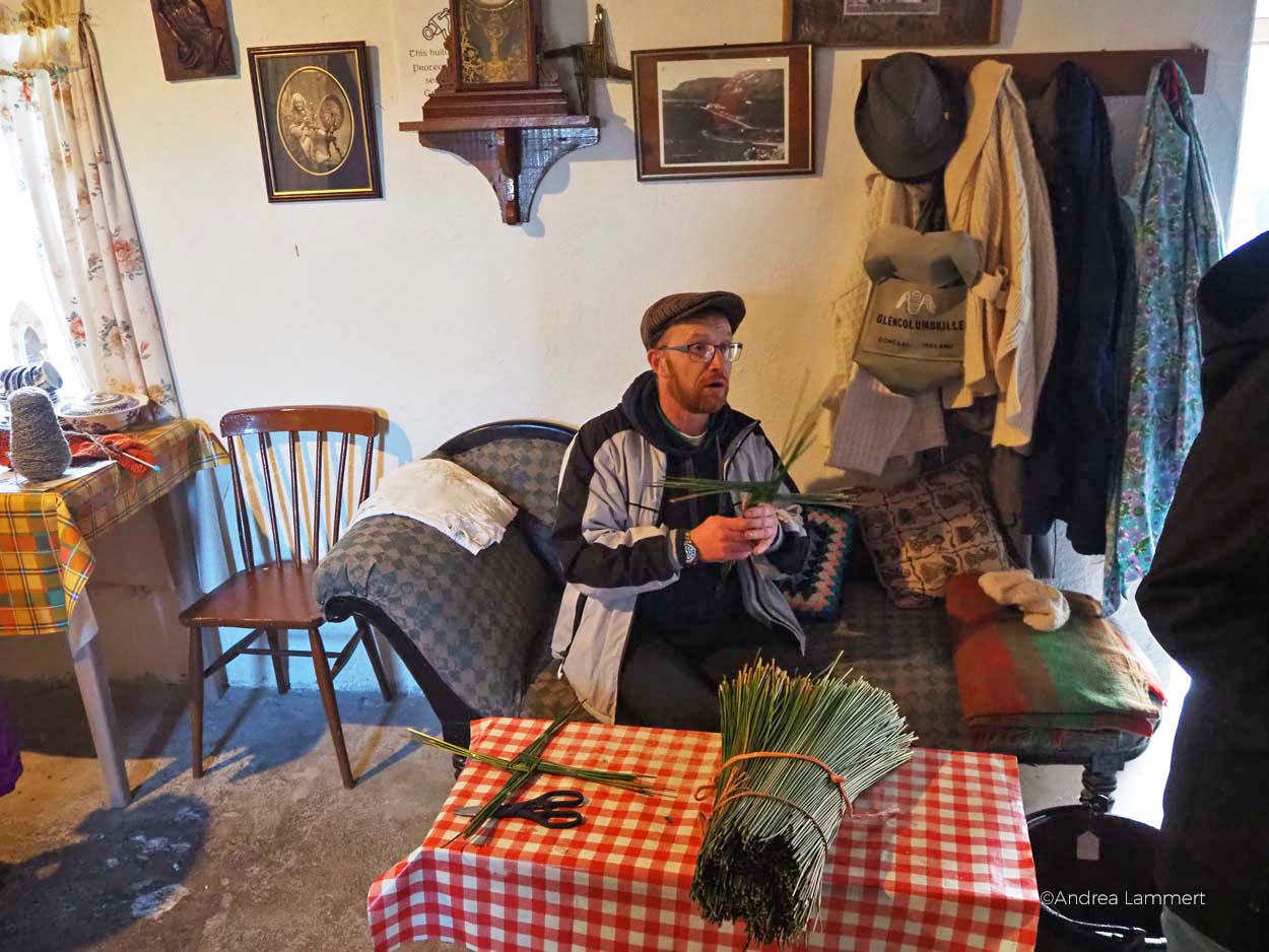 Am besten also hängt man es in die Küche. Die Tiere bekommen ein dreischenkliges Kreuz für ihre Ställe. David zeigt uns, wie man in nur wenigen Minuten ein Brigid’s Cross flechtet. Ganz so geschickt wie er bin ich allerdings nicht und brauche mindestens zwei Anläufe, bis es schön aussieht.