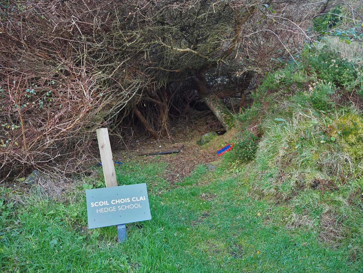 Die Zeit muss hart gewesen sein unter den Engländern, denn als wir in den Garten gehen, sehen wir ein Schild „Hedge-School“ (Heckenschule). Schulen, erfahre ich, waren in Irland nicht erwünscht, und so hatten die Iren sich Plätze in den Hecken gesucht, um ihre Kinder zu unterrichten. Immer bewacht von einem, der Zeichen gegeben hat, wenn der Landlord oder einer seiner Vertreter sich gezeigt hat.
