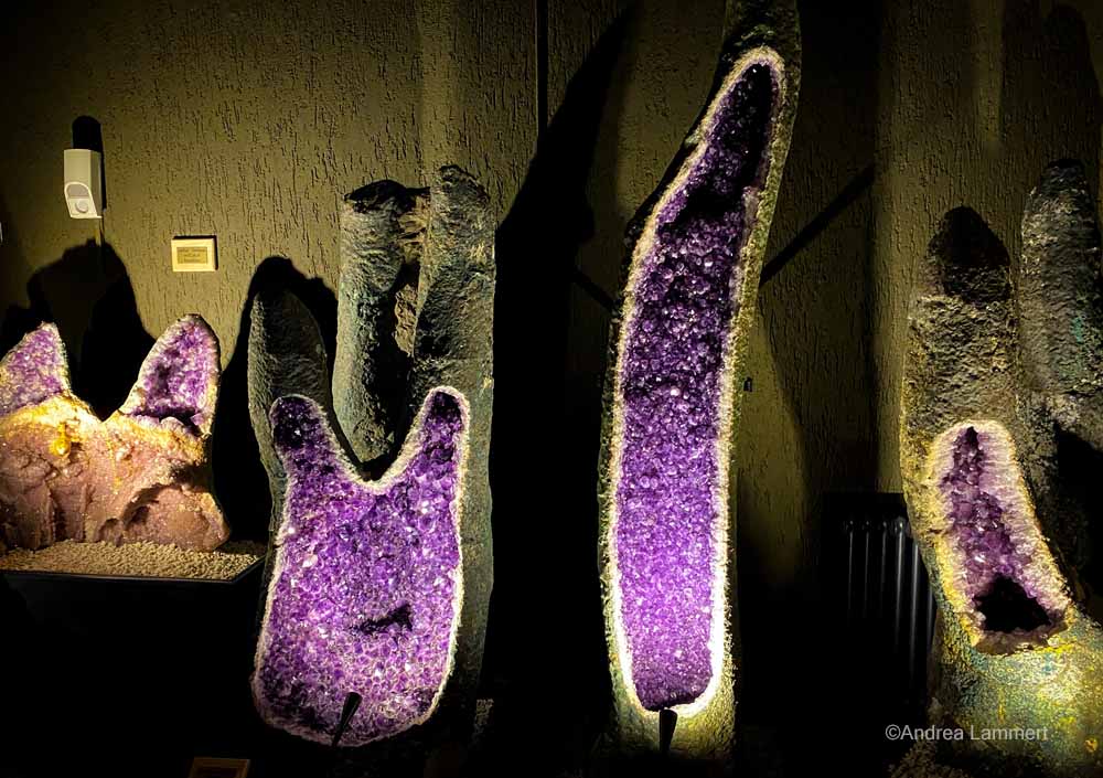 Die Edelsteine, die man im EdelSteinLand kaufen kann, stammen zumeist aus anderen Ländern – das hat durchaus Tradition in der Region, in der im 19. Jahrhundert die Edelsteine hauptsächlich geschliffen wurden, weil viele Menschen nach Übersee ausgewandert sind, um in den dortigen Minen zu arbeiten. Also muss man kein schlechtes Gewissen haben, wenn die Steine von weit her sind. Welche aus Idar-Oberstein zu ergattern, ist eher schwierig.