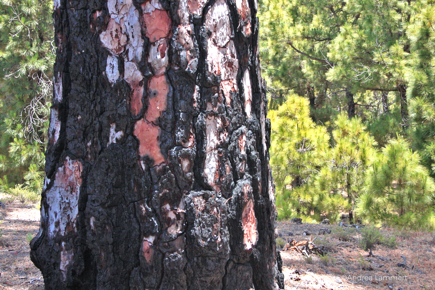 Feuerfeste Pinien? „Ja, tatsächlich gibt es sie hier“, sagt Sabine Rathjen und führt mich durch den Pinienwald bei El Pinar. Verkohlte Baumstämme sind hier zu sehen, schwarz und eigentlich hoffnungslos, doch dann haben sie irgendwann wieder ausgeschlagen und tragen neues Leben. Wie Phönixe aus der Asche. Weil dieser Wald stark feuergefährdet ist, halten hier Ranger Tag und Nacht Feuerwache in der Trockenzeit. Auch wenn die Bäume Feuer vertragen, man muss es ja nicht andauernd auf die Probe stellen. Heide und Pinienwald sind für mich auch magische Plätze auf El Hierro.