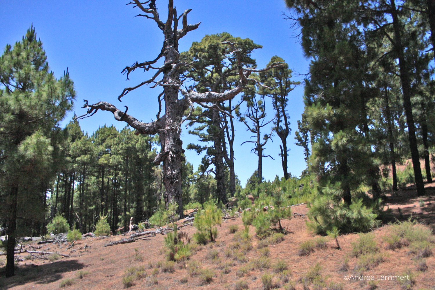 Heide kenne ich klein, niedrig und violett blühend. Aber mit dicken Stämmen, mehr als zwei Meter groß und knorrig wachsend? „Das ist Baumheide“, klärt mich Sabine Rathjen auf. Diese Wälder sind wirklich beeindruckend und wirken wie aus einer anderen Welt. Und sie sorgen für eine ganz besondere Luft. Noch aromatischer als die Luft im Wald von El Brezal hingegen ist der Pinienwald der Insel. Die Bäume, die dort wachsen, sind wirkliche Stehaufmännchen, denn sie sind feuerbeständig.