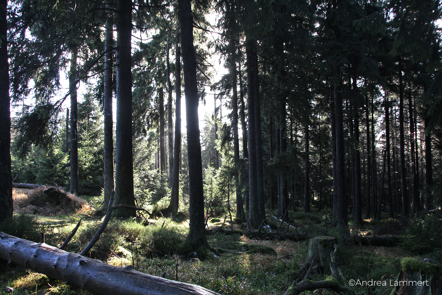 Zum Sonnenaufgang haben wir es leider nicht geschafft, das war mir zu ungewiss, denn es gab am Tag zuvor einen Sturm und ich wollte nicht im Dunkeln über Bäume stolpern. Was für eine gute Entscheidung, denn tatsächlich lagen einige umgestürzte Fichten in unserem Weg, der so verzaubert beginnt. Auf der niedersächsischen Seite des Goetheweges begleitet uns Landschaft wie aus dem Märchenwald. Von diesem dem Brocken gegenüberliegenden Gipfel startete auch Johann Wolfgang von Goethe seine Wanderungen auf den Blocksberg. Er war fasziniert von der Mystik des Harzes, von den vielen Sagen. Und von den verwunschenen Wäldern so inspiriert, dass er sie später in seinem Klassiker „Faust“ auch als Schauplatz der Walpurgisnachtfeiern verewigt hat.Nicht zufällig bin ich an Samhain, auch Halloween genannt, auf dem Brocken. Ist es doch die im Jahreskreis gegenüberliegende Feier zur Walpurgisnacht, einer magischen Zeit, in der die Energien ganz besonders sein sollen. Irgendwie bleibt der Brocken eben auch der Berg der Hexen.