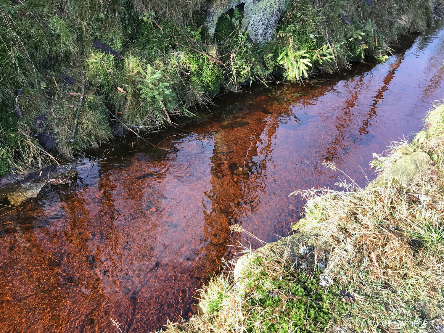 Bäche gurgeln am Wegesrand, das Wasser ist klar, aber der Untergrund strahlend rot, eingefasst werden sie von knallgrünem Moos und einer Landschaft auf knorrigen Fichtenwurzeln. Typisch Harz. Wir erreichen schon bald das Hochmoor Torfhaus, in dem auch der Radau-Fluss entspringt. Deswegen wird das Moor oft auch Radaubornmoor genannt. Mehr als 10.000 Jahre alt ist diese Landschaftsform, über die wir per Holzsteg wandern. Zwischen den Gräsern wachsen unter anderem auch fleischfressende Pflanzen wie der Sonnentau. Ich genieße den Fernblick über diese große Grasfläche, die bis zum glatzköpfigen Brocken reicht.