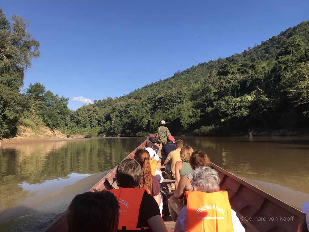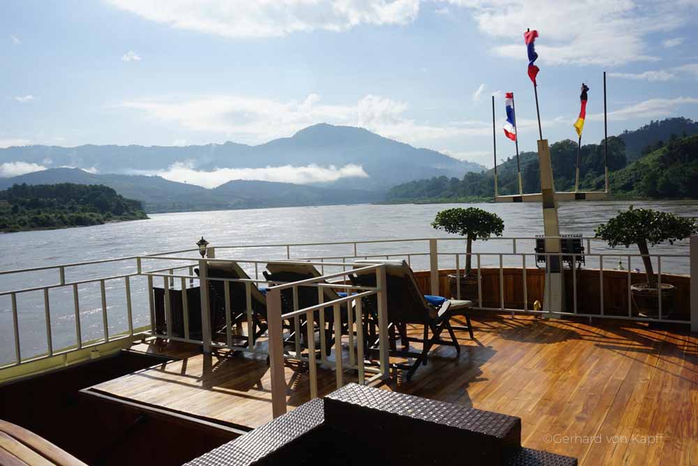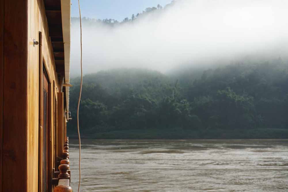 Der in diesem Bereich allenfalls 100 Meter breite Mekong schiebt das Schiff mit seiner starken Strömung voran. Hier ist der Fluss anders als am Mekong-Delta. Schließlich wollen wir Thailand und die Stadt Chiang Rai bald hinter uns lassen, das Ziel der Reise ist das sagenumwobene Laos. Schon nach einer guten halben Stunde bleiben die befestigten Ufer und die Bebauung zurück. Die Böschung rechts und links des Flusses ist sattgrün, und der Dschungel scheint umso undurchdringlicher, je bergiger die Landschaft wird. Die Reise auf dem großen Fluss beginnt. Der Mekong ist tückisch und unberechenbar – schon alleine deshalb wird nur tagsüber gefahren. Auf Sicht und ohne Navigations-Instrumente wie ein Echolot.