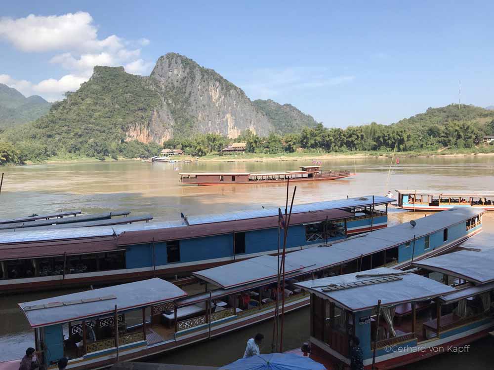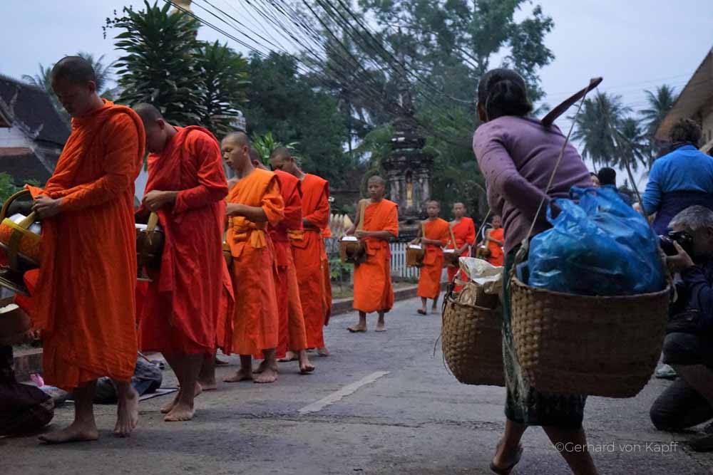 Im Gegensatz zur normalerweise gefahrenen Route, die mindestens bis zur Hauptstadt Vientiane führt, endet diese Reise in Luang Prabang. Die Stadt mit ihrem Einschlag aus der französischen Kolonialzeit ist UNESCO-Welterbe und eines der religiösen Zentren von Laos. Deutlich wird das vor allem morgens, noch vor dem Sonnenaufgang. Die Mönche in ihren orangefarbenen Gewändern laufen durch die Straßen und nehmen Spenden von den Gläubigen entgegen. Meist Nahrungsmittel wie Reis, das sie in den Schüsseln, die sie mit sich tragen, sammeln. Eine stille Zeremonie, die nur noch an wenigen Orten der Erde beobachtet werden kann. Aber auch ein so schöner wie beeindruckender Ausklang einer ganz besonderen Schiffstour.