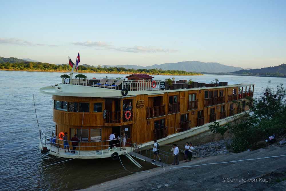 Die Mekong Pearl ist eigentlich ein alter Bekannter auf dem Fluss. Vor Jahren befuhr es noch als Mekong Explorer den Fluss, dann aber wurde es ein Opfer der chinesischen Staudämme. Eigentlich lag es auf dem Trockenen, die Antriebswelle war zur Überholung ausgebaut, aber plötzlich ließen die Chinesen ohne jede Ankündigung von einem der gewaltigen Staudämme am Mekong so viel Wasser ab, dass der Pegel über Nacht um etliche Meter stieg. Am nächsten Morgen war die Explorer vollgelaufen. Die Besitzer, die Mekong River Cruises, nutzten die Katastrophe als Chance, renovierten das Schiff und reduzierten sogar die Kabinenzahl.