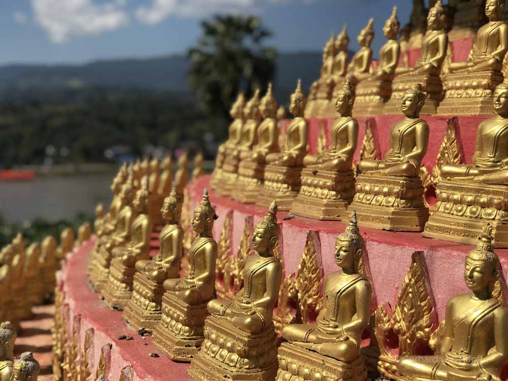 Einer der Höhepunkte der Fahrt ist der Besuch der Pak Ou Höhlen. Tausende kleine und große Buddha-Statuen wurden im Laufe der Jahrhunderte in der Höhle abgestellt. Teils sieht man ihnen das Alter bereits an, erkennt, mit welch geringen handwerklichen Mitteln sie geformt wurden, teils sind es ganz neue Figuren, überzogen mit Blattgold oder zumindest goldener Farbe.