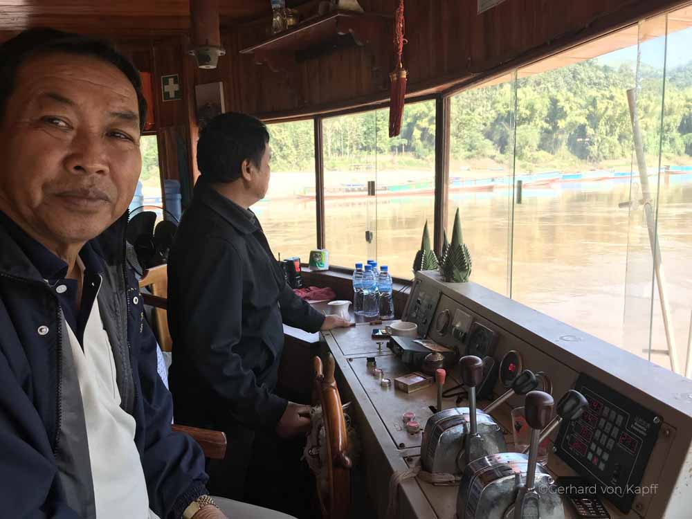 Diese Fahrt soll auch eine Begegnung mit den Kulturen und den Menschen am Flussufer sein, und deshalb springen die Schiffsjungen schon mittags wieder an Land. In den Händen ein Tau, einen Hammer und hüfthohe Metallheringe, die sie ins Erdreich schlagen. Anlegeplätze sind in Laos Mangelware.