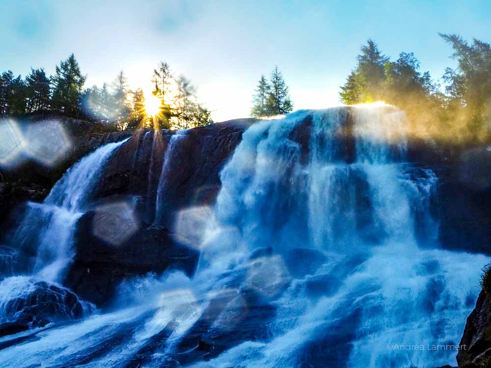 Wir haben uns all diese Aktivitäten geschenkt und sind dem Tipp unserer auf Tysnes lebenden Irin gefolgt und zum Bondhusvatnet-See gefahren. Zuerst war ich ein wenig enttäuscht, denn den Gletscher würden wir hier wohl nur erahnen können. Dennoch ist dieser Rundweg wohl einer der schönsten im Folgefonna-Nationalpark. Der Bondhusvatnet ist erreichbar über den Ort Sundal. Der Wanderparkplatz liegt ganz am Ende des Ortes. Doch bevor wir dorthin kommen, schickt uns der Folgefonna noch ein paar Grüße in Form von Wasser. Der Wasserfall Furebergsfossen liegt direkt an unserer Straße und strömt fast über die Fahrbahn. Erst später erfahren wir, dass das gefährlich ist, denn bisweilen spuckt er auch Steine und Geröll auf die Autos.