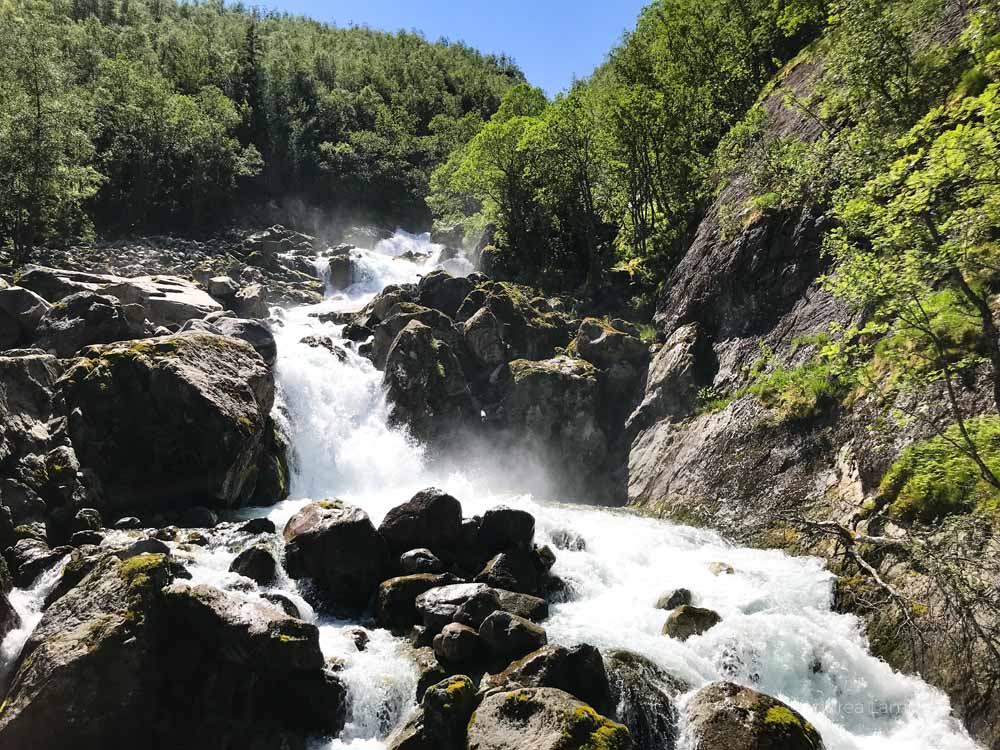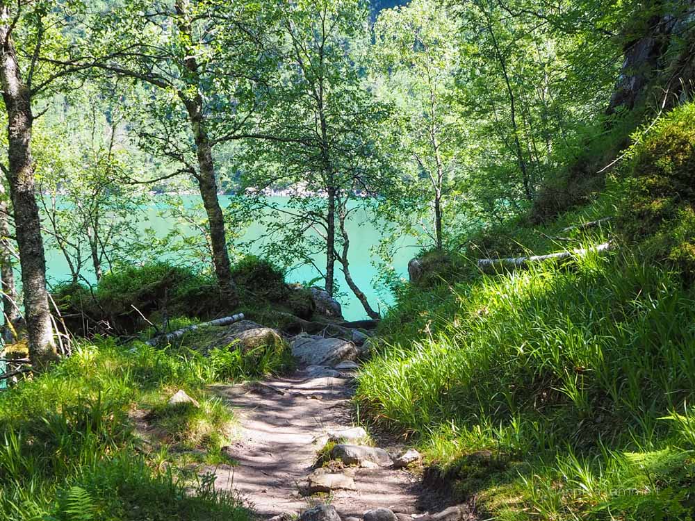 Bundhusdallen heißt das Tal, in dem sich der See und auch unser Wanderweg befinden. Es ist eine wirklich schöne Tour, die nicht nur durch Wälder führt, sondern immer entlang des türkisblauen Sees. Am anderen Ufer angelangt, empfangen uns mehrere Wasserfälle und der Strand des Gletschersees lädt ein, die Füße zu kühlen. Wir versuchen noch ein wenig weiter zu wandern und machten uns auf den Weg zum Vetledalen. Der Weg führt steil bergab zum Bondhusbrea-Gletscher, mit etwas Glück kann man dort das ewige Eis sehen. Doch wir machten schon bald wieder kehrt, denn die Strecke war sehr morastig, unsere Schuhe sanken tief ein und es gab auch weit und breit keine Karten oder Hinweisschilder mehr.