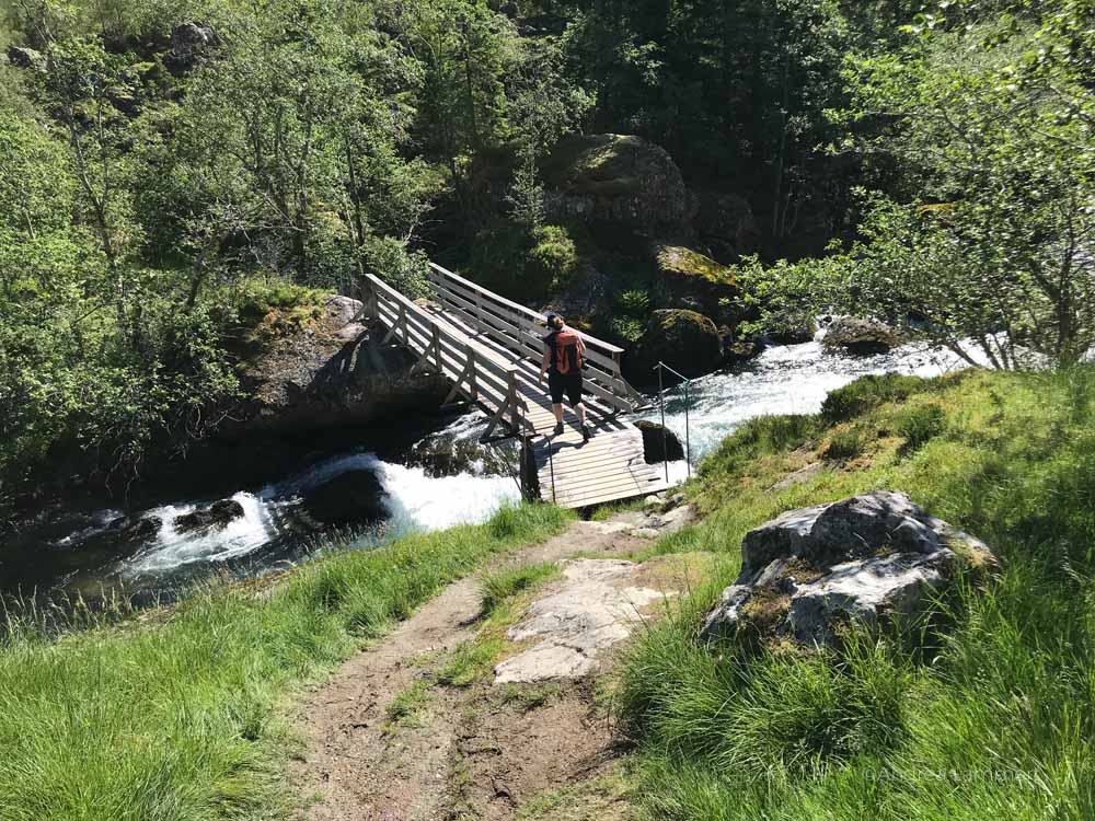 Diese frische Luft mit einem Hauch von Kalt empfängt uns auch am Parkplatz Bondhusvatnet. Wasser sprudelt Bondhusvatnet-See in einem Bach gen Hardangerfjord. Dieser Bach bleibt für die nächste dreiviertel Stunde unser Begleiter, wir wandern bachaufwärts gen See. Es ist Juni und Sonntag und tatsächlich ist der Bondhusvatnet ein beliebtes Ausflugsziel.