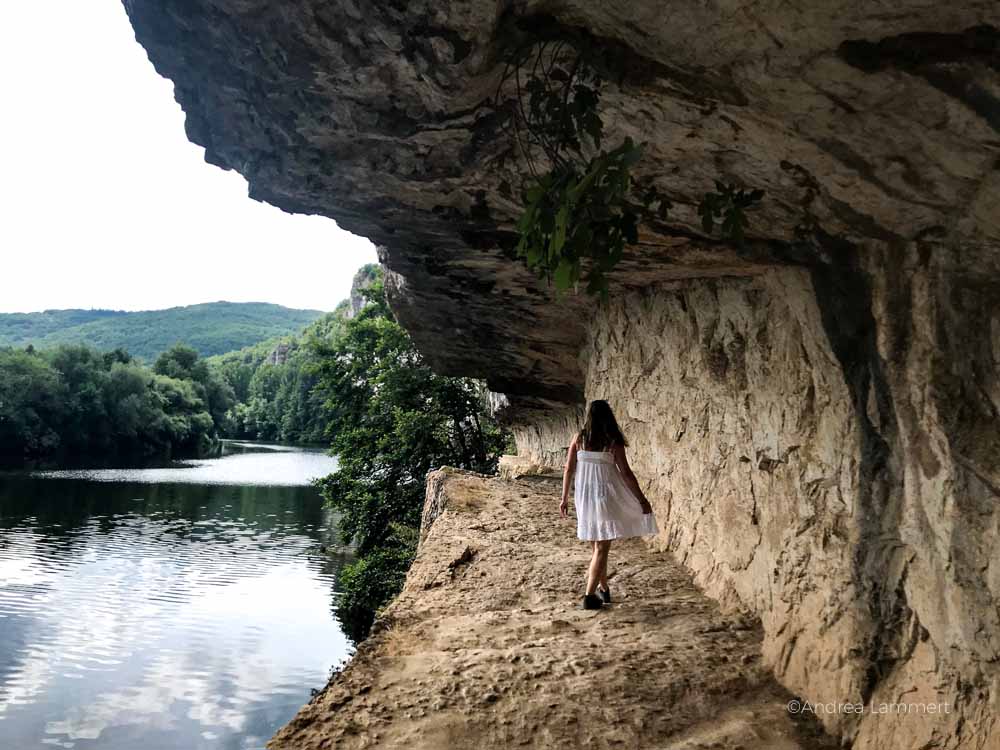Nur einige Kilometer von Cabrerets entfernt befindet sich Bouziès, ein kleines Dorf am anderen Ufer des Lot-Flusses. Die Brücke und das Dorf an sich sind schon sehr hübsch, aber Bouziès hat noch ein Geheimnis: Der Treidelpfad am Lot-Ufer ist etwas ganz Außerordentliches, denn er ist wie eine halbe Höhle in den Stein gehauen.