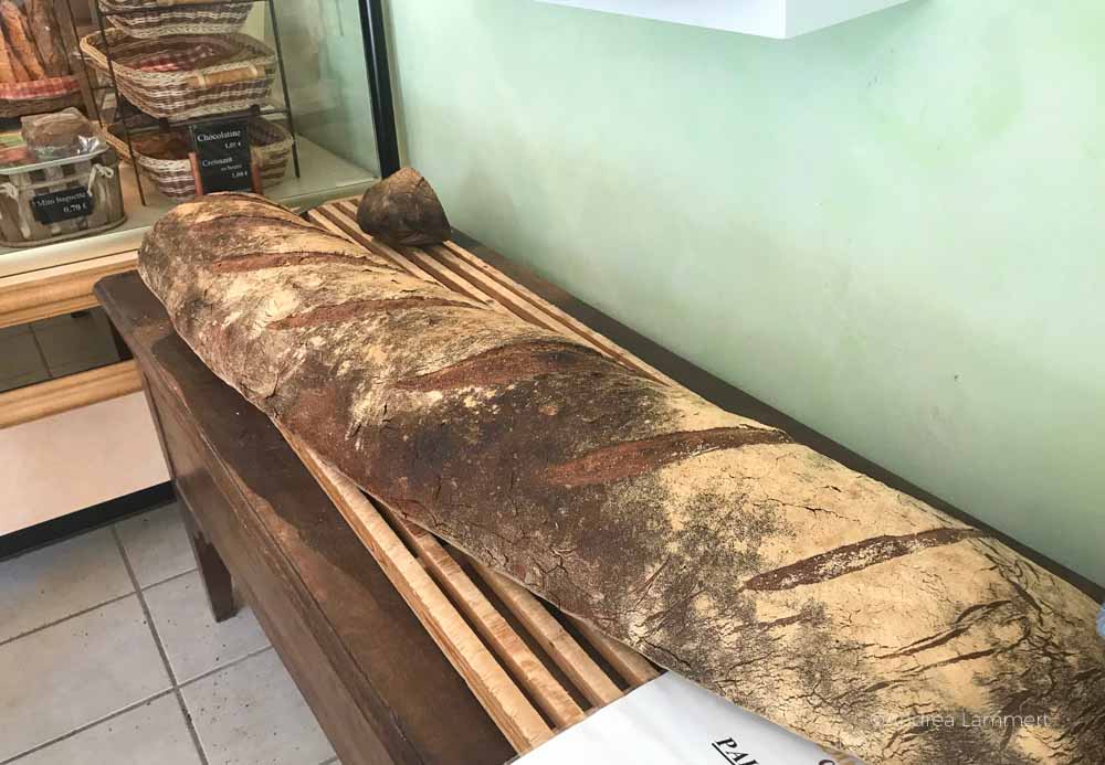 Die Bäckerei „Du Moulin au Fournil“ und arbeitet mit eigenen Mehl, das in der Region gemahlen wird. Daraus fertigt sie nicht nur knusprige Baguettes, sondern auch die längsten Brote, die ich jemals gesehen habe, ich glaube, sie waren wohl 1,50 Meter lang. Man konnte sich Stücke davon abschneiden lassen und kaufen. Wir haben lieber die leckere Gemüsetarte und die Croissants Amandes gegessen.