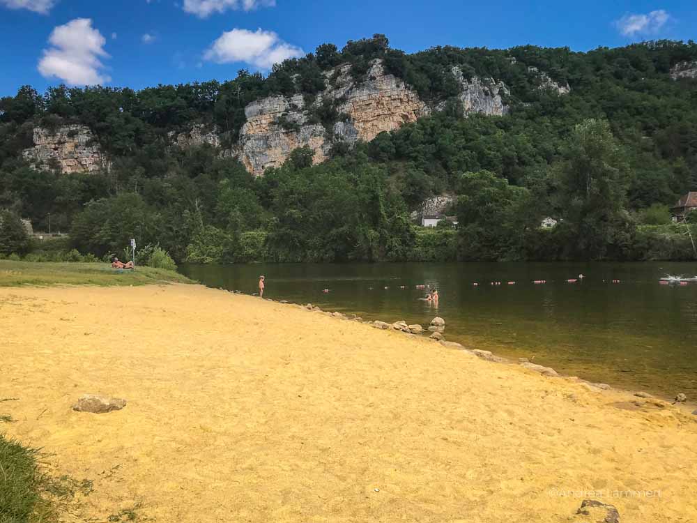 Unterhalb von Saint Cirq de Lapopie befindet sich ein schöner Sandstrand, der kostenlos zu benutzen ist. Angeschlossen ist ein Campingplatz mit einer kleinen Imbiss- und Verkaufsbude, manchmal stellt sich auch die örtliche Käserei mit einen Verkaufswagen hin und bietet Schafskäse feil.