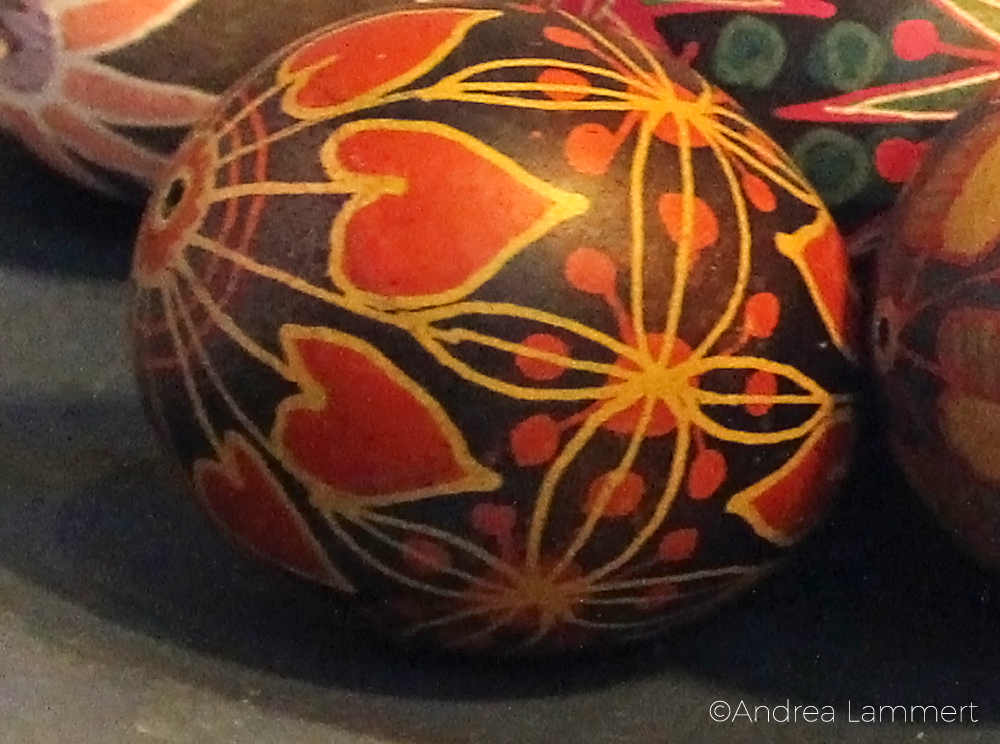 Wolfszähne, ein Muster aus Dreiecken, soll vor bösen Einflüssen schützen und Sonnensymbole und ihre Strahlen stehen für Wachstum. „Heute ist diese Tradition leider fast in Vergessenheit geraten, aber ich möchte sie wieder aufleben lassen“, sagt er, deswegen bemalt er seine polnischen Ostereier nicht nur, sondern unterrichtet auch andere Menschen in Kursen, solche Kunstwerke aus ausgeblasenen Eiern zu fertigen. Scheint ein Trend zu sein, denn alle seine Workshops in diesem Jahr sind schon ausgebucht. Wundert mich nicht.