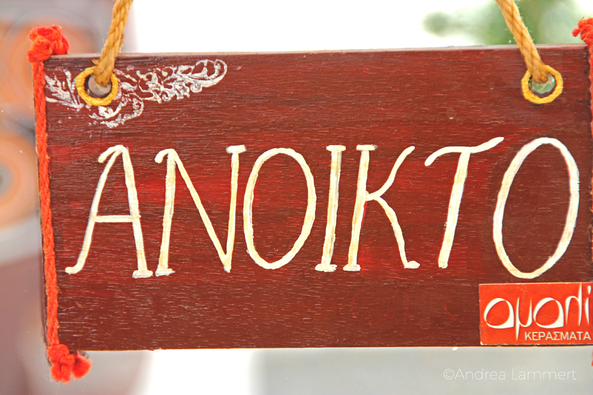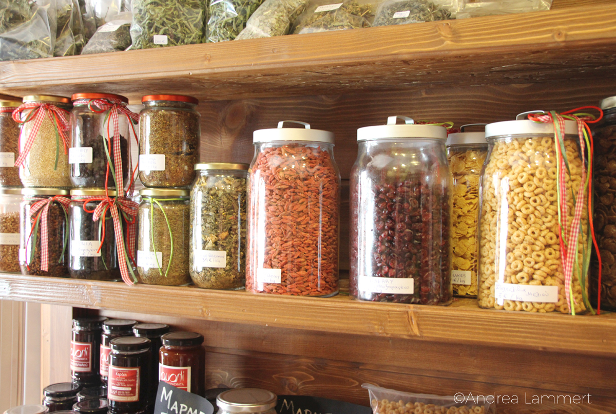 Getrockneter Bergkräutertee, Malve, Salbei, Goji-Beeren, selbstgemachte Marmelade und Honig von der zweitgrößten griechischen Insel stapeln sich in den einfachen Holzregalen, bunte Bänder um die Gläschen, irgendwie sieht es aus wie in einem Tante-Emma-Laden. Ich könnte stundenlang schauen, schade dass mein Koffer so klein ist.