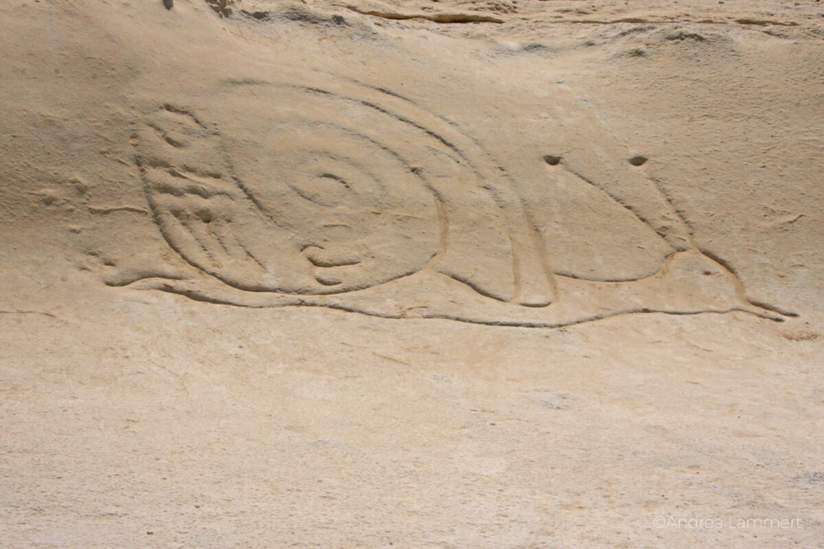 Diese alten Graffitis aber nicht. In den weichen Sand sind Zeichen hineingeritzt – wunderschön, bestimmt nicht alt, aber es hat etwas von Felsmalerei. Manchmal liegen die Kraftorte nur etwas weiter entfernt von den antiken Stätten, sind aber nicht minder wirksam.