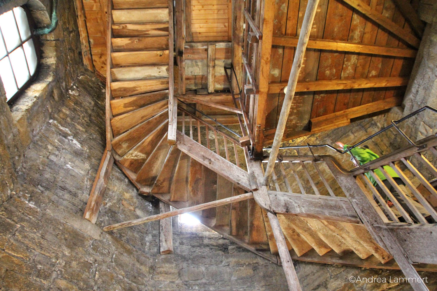 Es sind 233 Stufen nach oben – und eine echte Mutprobe für meine Tochter, die noch nie auf einen Turm gestiegen ist. Man kann durch die Holzstiegen hindurchsehen und ich kann die weichen Knie meiner Tochter regelrecht mitfühlen. Hilft nichts, wir sind tapfer und halten durch bis uns oben eine Überraschung erwartet. Denn die letzten Stufen sind tatsächlich nur eine Leiter, eine steile Stiege.