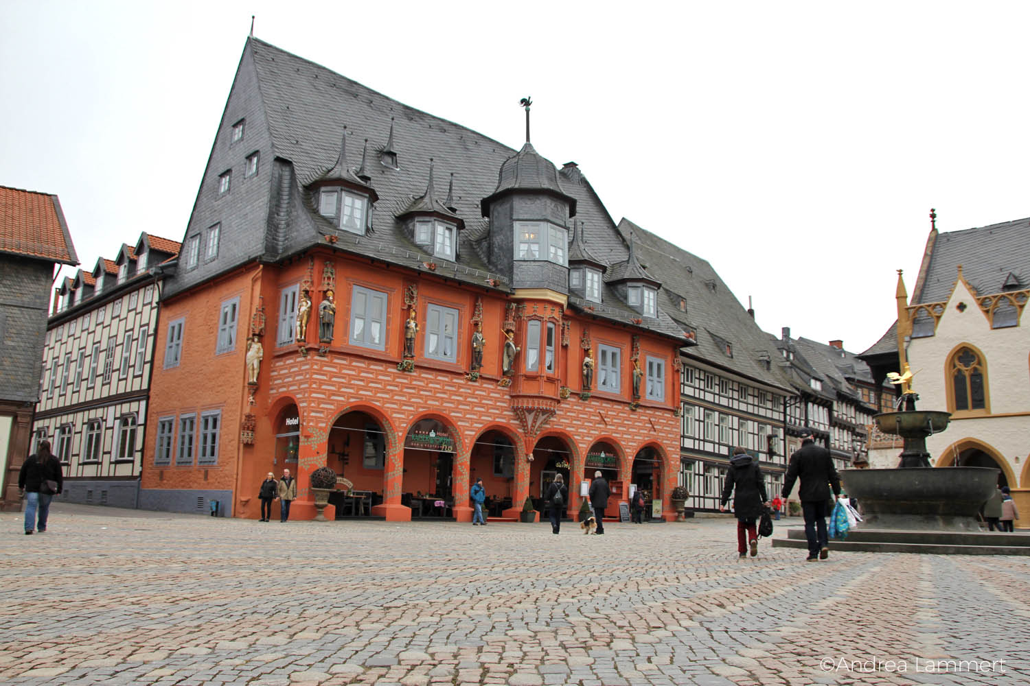 Nein, auch wenn Wikipedia es anders sagt, es ist kein Adler, wie wir in der Kaiserpfalz gelernt haben, sondern tatsächlich der Sagenvogel. In der Kaiserpfalz befindet sich die Originaldachfigur aus Bronze aus dem 13. Jahrhundert. Dort lernt man auch, dass das Fabelwesen als Bewacher und Förderer von Reichtum und Gold gilt. Am Brunnen glänzt eine Replik wunderschon golden in der Sonne.  Dahinter leuchtet das Hotel Kaiserworth knallorange – auch ohne Sonne. So macht Goslar gute Laune. Gegenüber liegt das Rathaus mit dem berühmten Huldigungssaal und seinen Fresken. Und dem gegenüber das Hotel Schiefer, in dessen Giebel ein Glockenspiel von der Geschichte des Bergbaus am Rammelsberg erzählt.