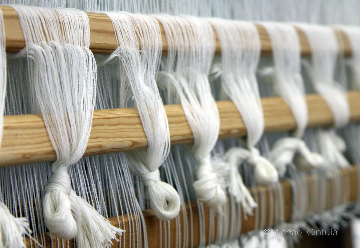 Mit geschickten Handbewegungen verdrehen die Frauen am Ende die Fäden zu einer Kette, das fast einmal durch die Halle der Weberei läuft. Weben gehört zu den ältesten Handwerkstechniken der Menschheit, schon in den ägyptischen Gräbern wurden alte Gewebe gefunden. Und in der Jungsteinzeit vor rund 6000 Jahren haben die Menschen die ersten Webrahmen und Webstühle erfunden, in denen Rindenbast, Flachs und Wolle verarbeitet wurden. Die Technik ist seitdem immer dieselbe. Eines ist dabei ganz wichtig: dass eine Ordnung eingehalten wird. Wird ein Faden falsch geschärt oder in den Kamm aufgespannt, entstehen Ungleichmäßigkeiten im Stoff.