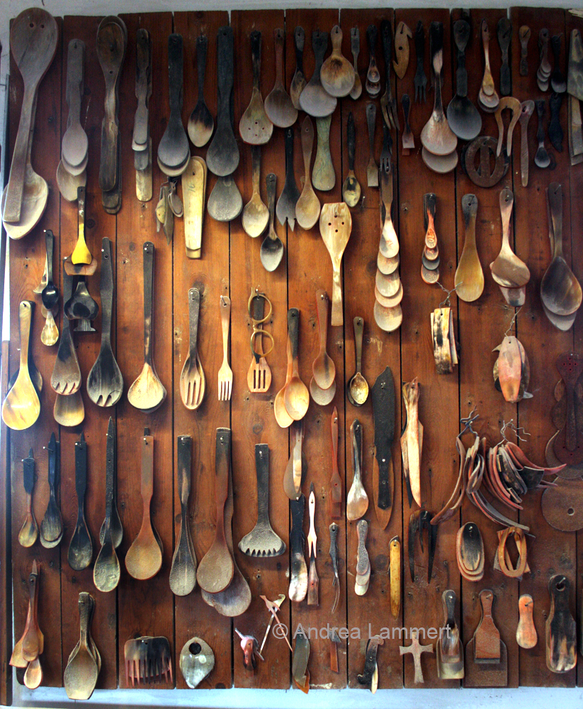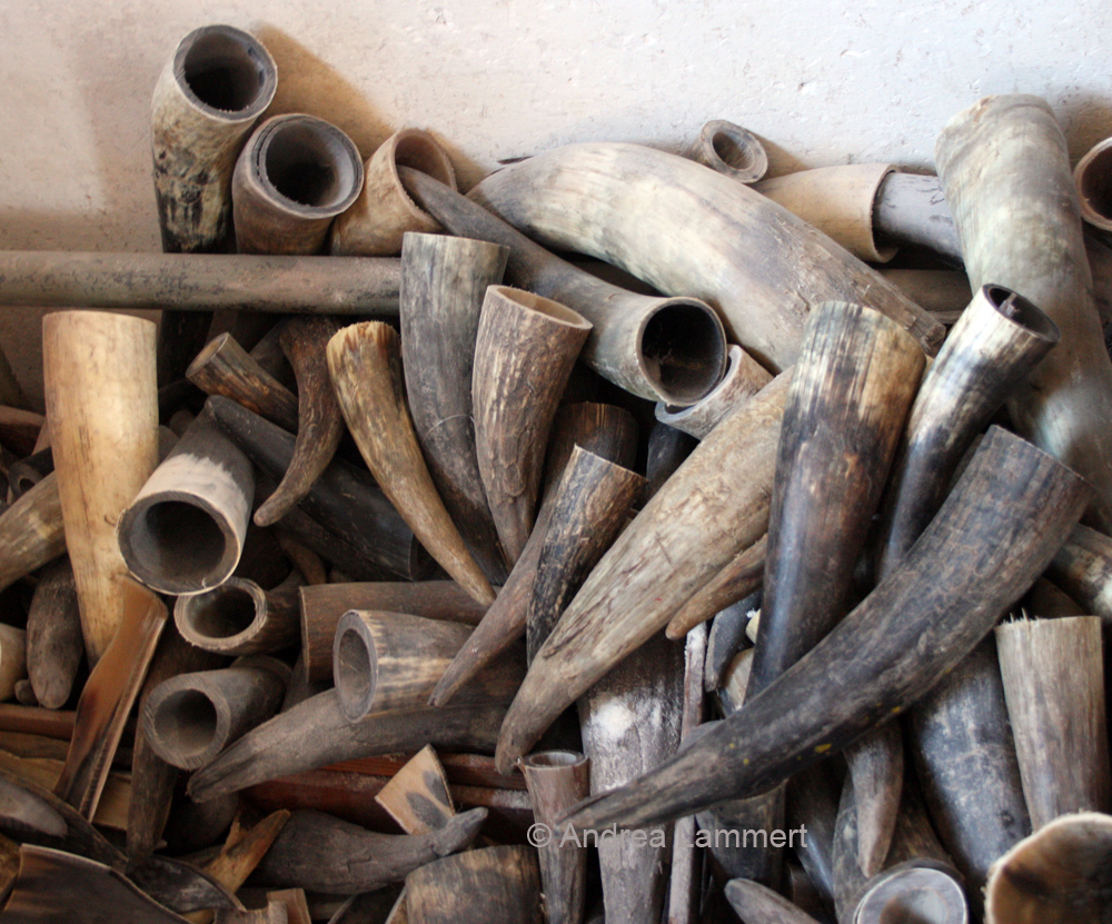 Die Augen von Sara Frølund leuchten stolz hinter ihrer schwarzen Hornbrille, als sie den Rundgang beginnt. In einer Ecke stapeln sich malerisch hunderte von Kuhhörnern, die Kunsthandwerkerin greift eines der sich ein Horn, hält es prüfend ans Licht. „Nicht jedes Horn ist gleich, alle sind anders und haben eine andere Maserung. Dieses ist perfekt für einen schönen Salatlöffel“, erklärt sie und streicht eine Strähne aus den kurzen schwarzen Haaren zurück. Dann greift sie zu einem riesigen Holzbrett, an dem lauter Schnittmuster aus Stoff hängen – sie sehen aus wie platte Löffel aus verstaubtem Jeansstoff. „Ja, der Staub gehört dazu“, sagt sie und geht mit dem Horn zur Säge, um die erste grobe Form auszuschneiden. Computer oder andere Maschinen kann sie nicht gebrauchen, denn das Horn ist ein Naturprodukt. Hier braucht man einen Menschen, der bei jedem Löffel die Stelle mit der schönsten Maserung per Hand aussucht und das Horn auf kleine Risse oder Schäden prüft. „Das kann man nicht automatisieren, ein Computer weiß gar nicht, wo die Schönheit liegt“, weiß sie. Und genau darin liegt der Reiz des Materials. Die Hörner übrigens kommen schon lange nicht mehr von dänischen Kühen. „Das war sowieso paradox“, mischt sich nun Saras Mann Peder ins Gespräch ein. „Früher hat man die Kühe aus Dänemark in die Schlachthäuser nach Hamburg gefahren und wir haben von dort unser Horn wieder zurücktransportiert.“ Heute hat kaum eine Kuh zwischen Skagen und Sonderborg Hörner, sie werden schon vorher entfernt. Deswegen bezieht die Manufaktur die großen geschwungenen Hörner aus Nigeria.